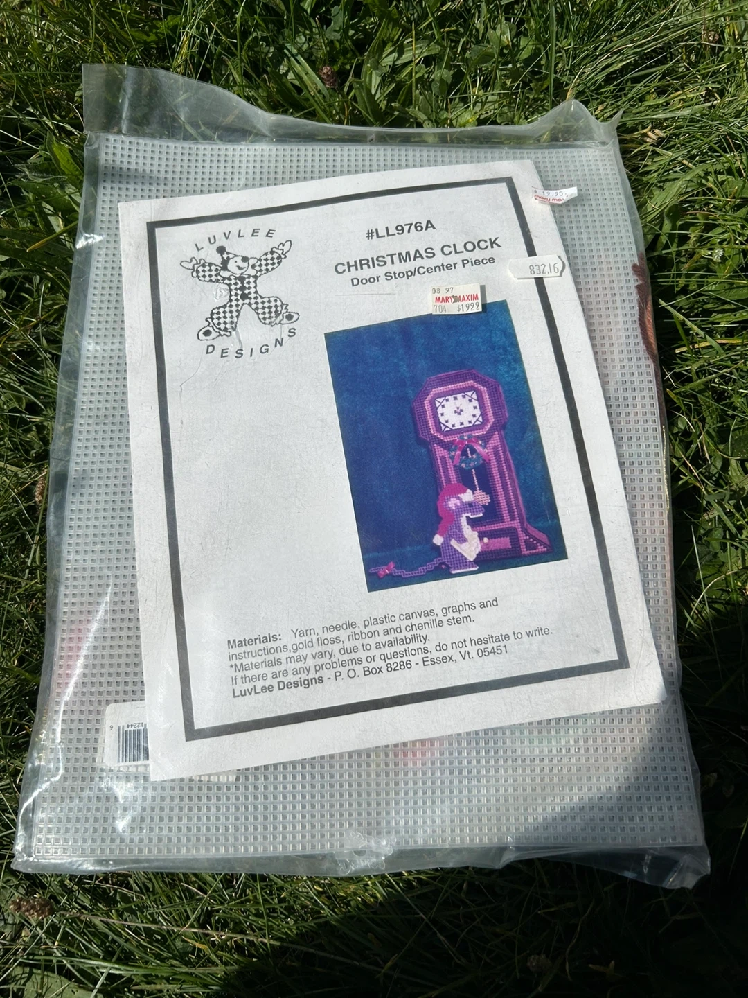 Selling a LuvLee Designs Christmas Clock Door Stop/Center Piece kit! It includes the yarn, needle, plastic canvas, graphs, and instructions. Also includes felt floor, ribbon and chenille stem. A fun craft project for the holidays!