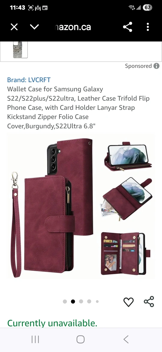 Selling a wallet case for a Samsung Galaxy S22. It's a leather-like trifold flip phone case with a card holder, lanyard strap, kickstand, and zipper folio. The colour is burgundy and the size is 6.8".