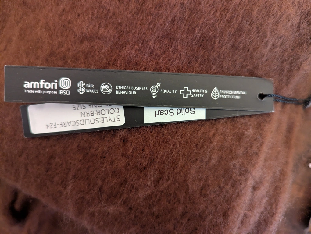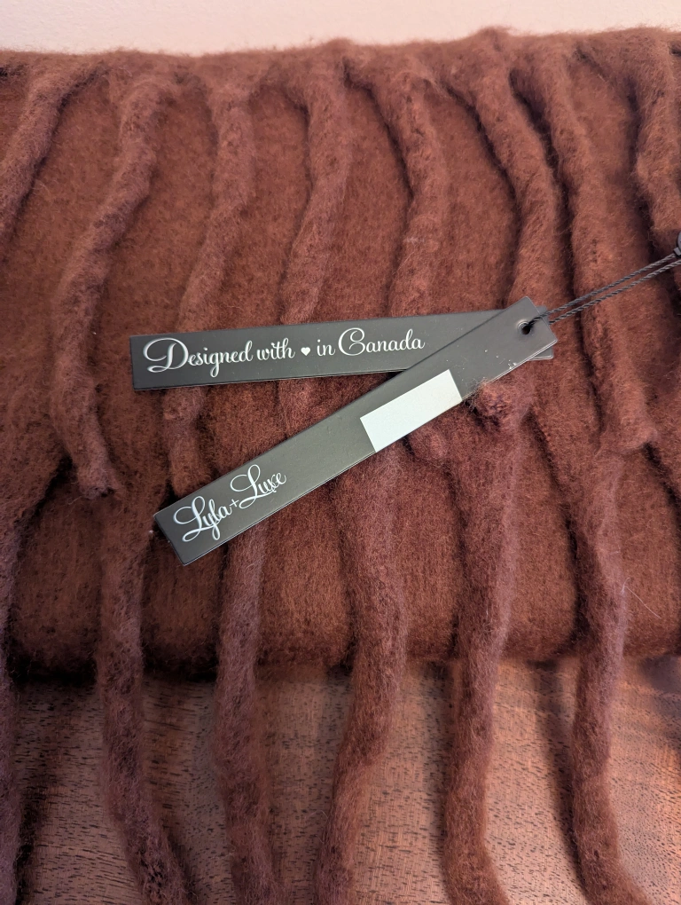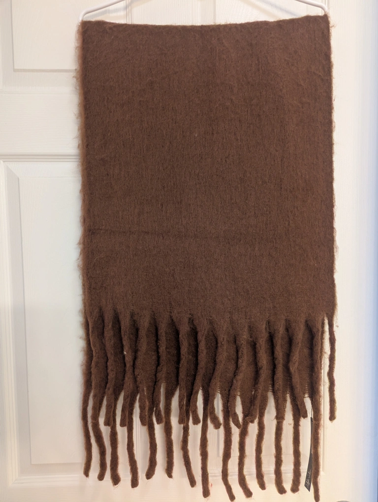 Luxurious brown scarf. Features long fringe. Designed in Canada. Soft and cozy. Perfect for fall and winter. 7ft long. Never used. Retail value of $79, from "homebody", store in Oakville.