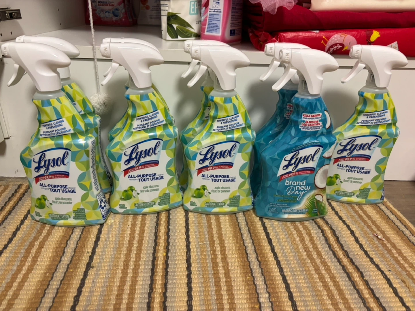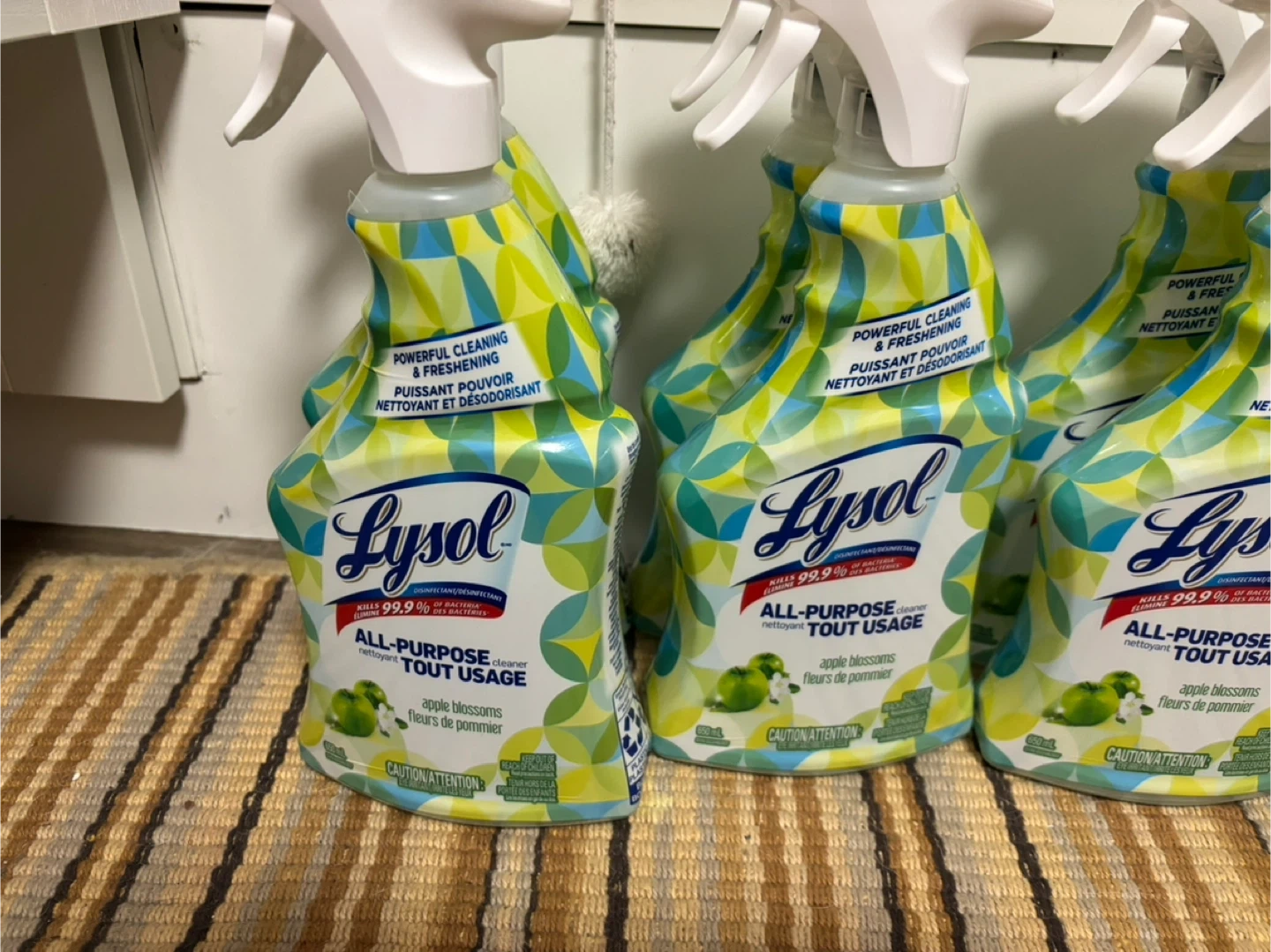 Selling a bottle of Lysol All-Purpose Cleaner in the Apple Blossom scent. It's great for powerful cleaning and freshening your home, leaving a pleasant scent of apple blossoms. Perfect for everyday use to keep your spaces clean and smelling fresh