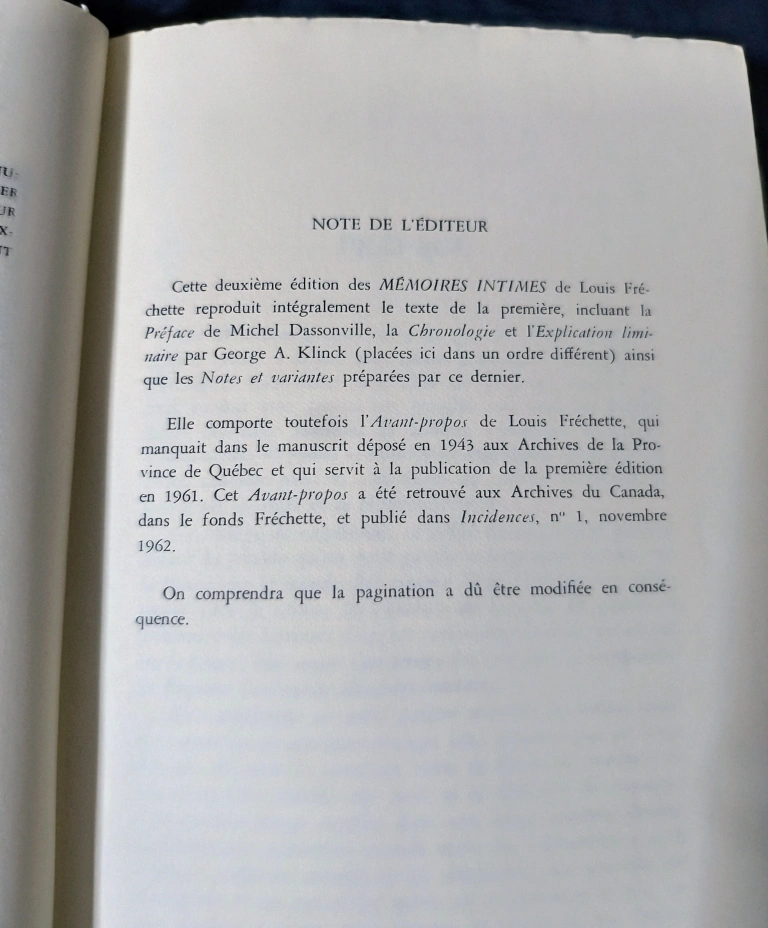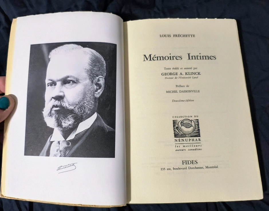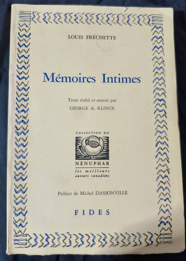 "Mémoires Intimes" Authored By Louis Fréchette. It's part of the Collection du Nénuphar series. A great addition to any book collection, or anyone passionate about Canada, specifically Quebec. ** Buying Canadian, Supporting Canadians ** ** PIck Up In Kentville **