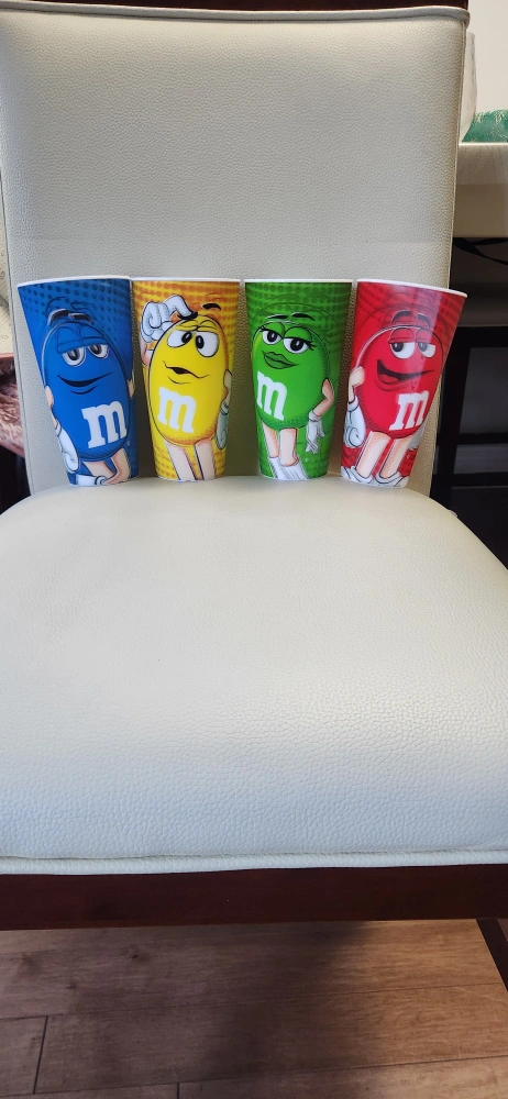 Selling a set of four M&M's World plastic cups, each featuring a different coloured M&M character and a fun saying. A cute addition to any collection! Pick up in Orleans.