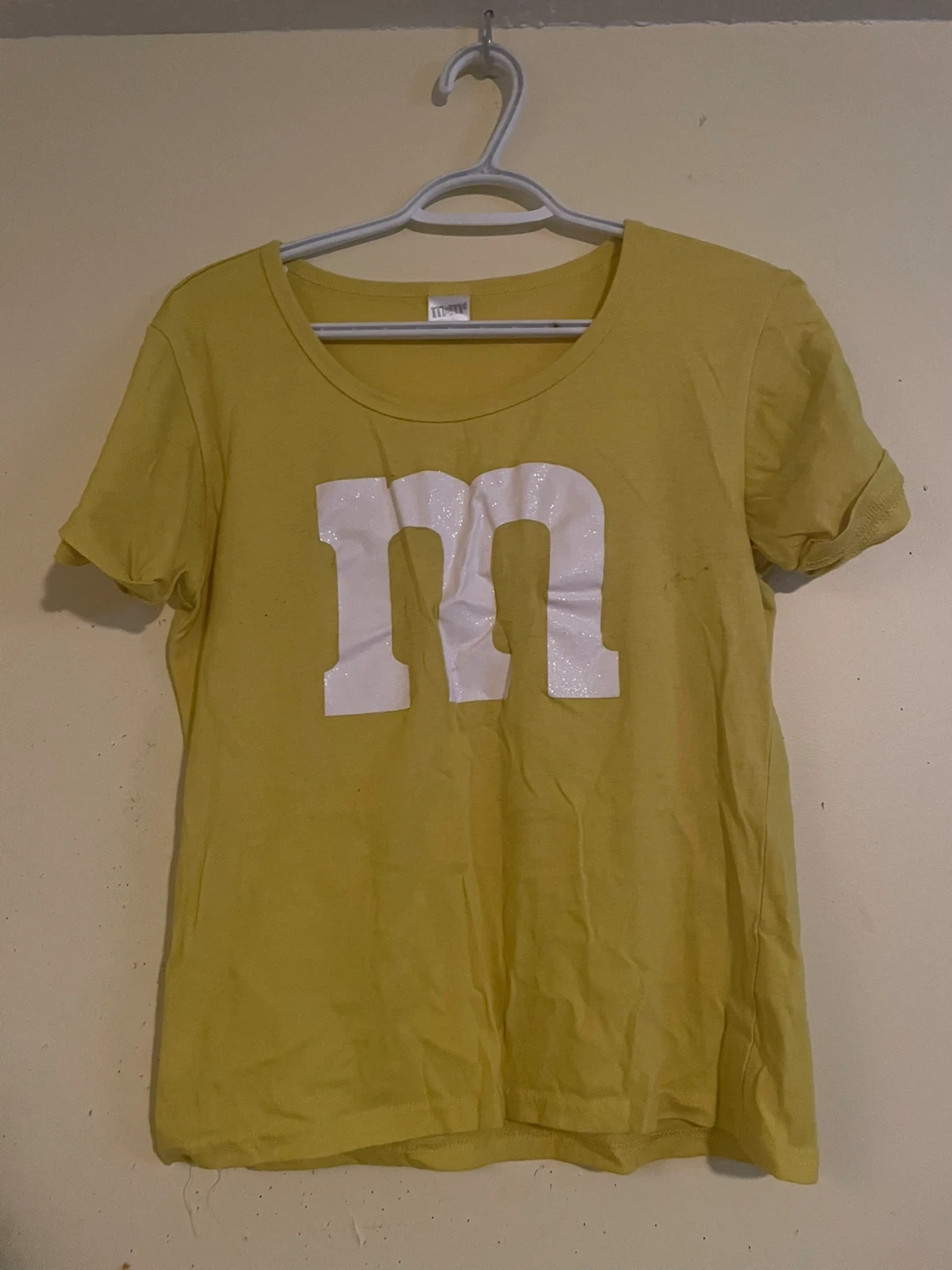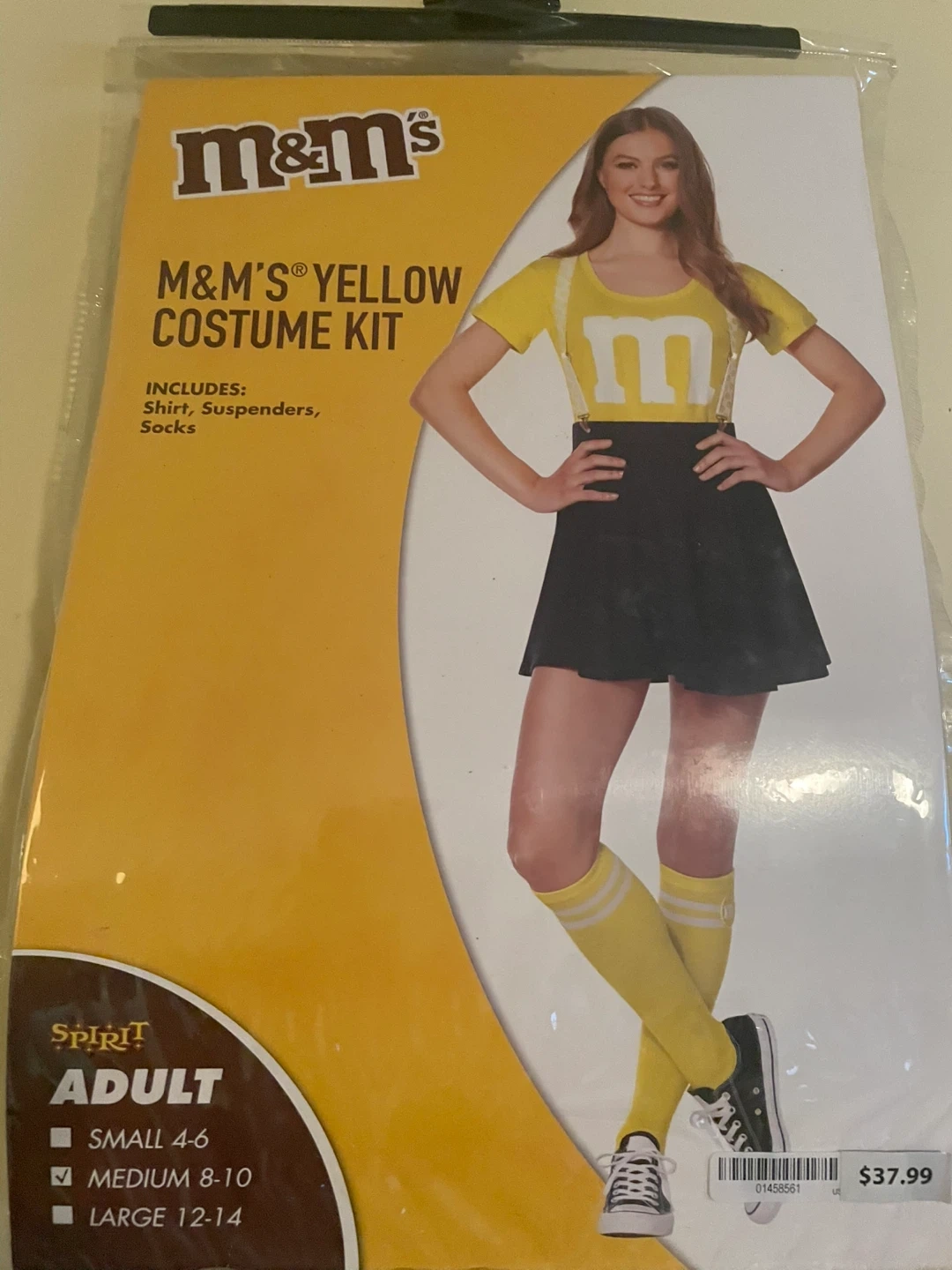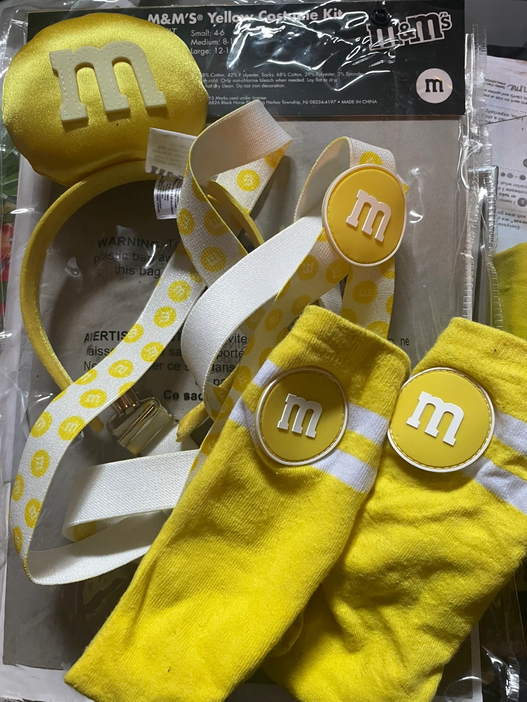 Selling a complete M&M's Yellow Costume Kit for adults. Size is Medium (8-10). Includes: - Shirt - Suspenders - Socks - Headband (bought separately) Perfect for Halloween or any costume party!