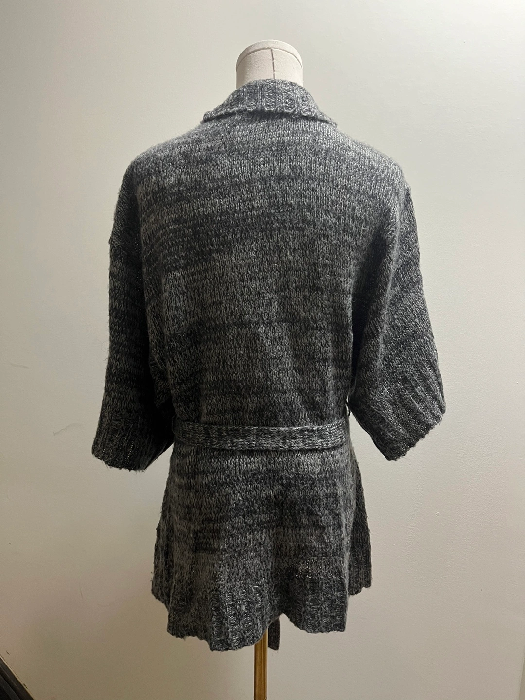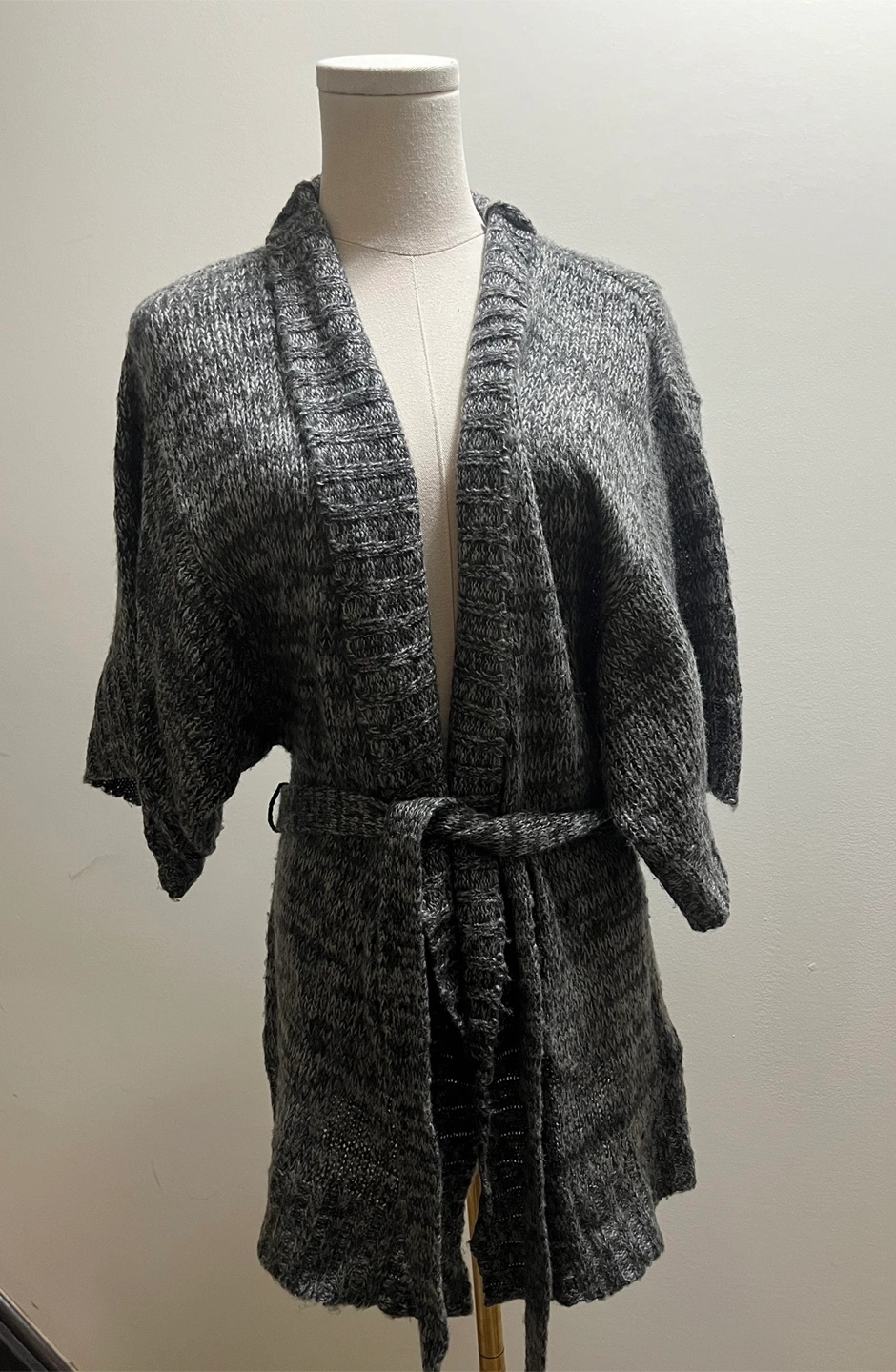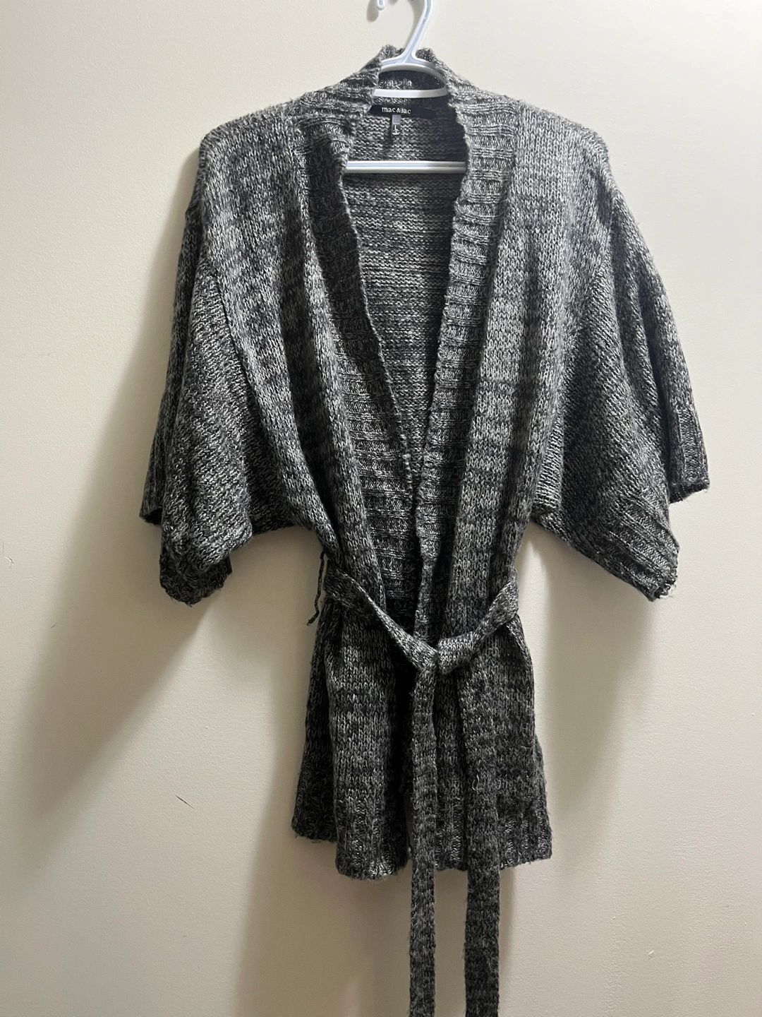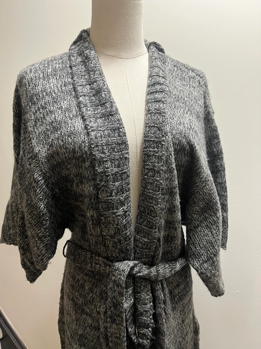 Stylish charcoal knit sweater. Ideal for layering. Excellent condition!! Pickup Brampton or downtown Toronto The string to hold the belt has ripped from one side but it’s an easy stitch! Super soft and cozy!! 100% acrylic