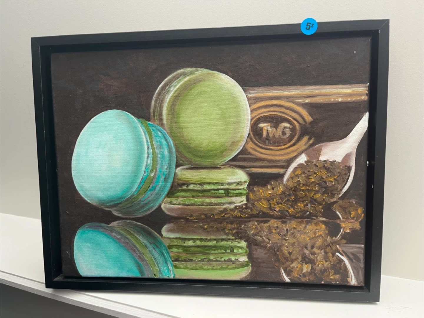 A charming painting featuring colourful macarons and TWG tea. It's framed and ready to hang, adding a touch of sweetness to any room!