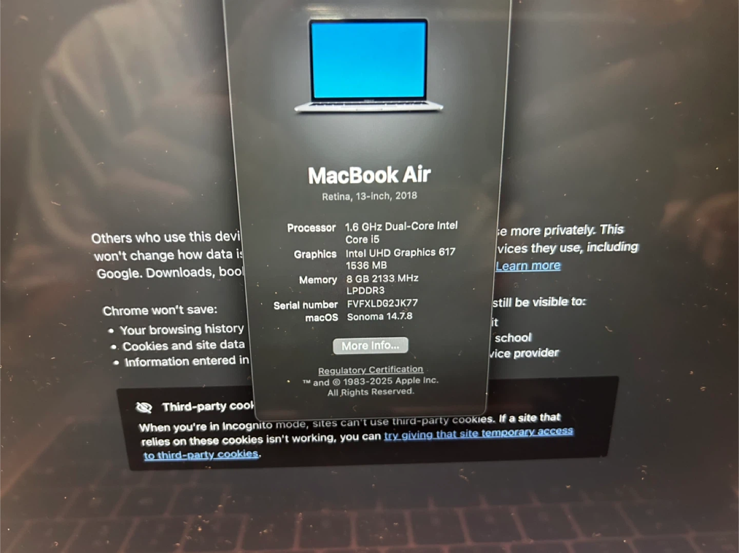 Selling a MacBook Air 13-inch from 2018. It has a 1.6 GHz Dual-Core Intel Core i5 processor, Intel UHD Graphics 617 graphics card, 8 GB of memory, and LPDDR3. Runs on macOS Sonoma 14.7.8. Battery health is normal. Only a few minor scratches and dents