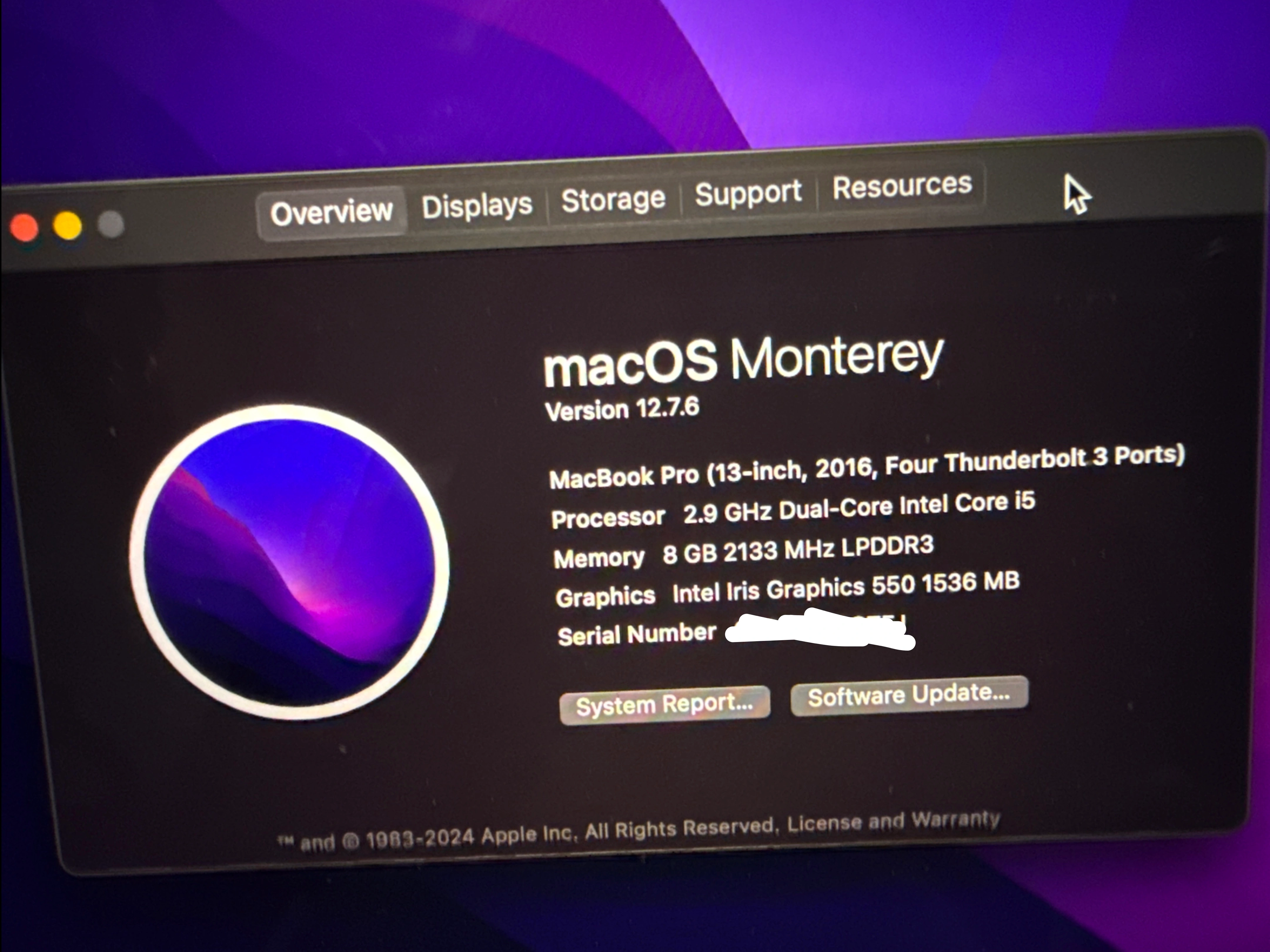Selling a MacBook Pro 13-inch from 2016. It has a 2.9 GHz Dual-Core Intel Core i5 processor and 8 GB of memory. Runs macOS Monterey version 12.7.6 251 GB flash storage laptop only no charger cable provided, working condition