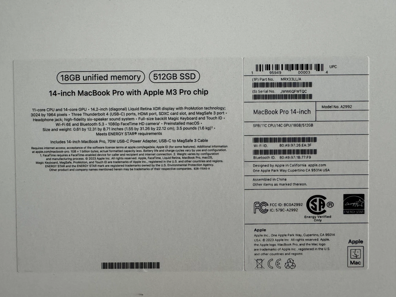 This is a 14-inch Apple MacBook Pro with the powerful M3 Pro chip, 18GB of RAM, and 512GB SSD, in the sleek Space Black colour. I purchased it in May 2024 but couldn't get used to it. The laptop is in brand new condition and has barely been used. Perfect for anyone looking for top-notch performance and elegant design. Don’t miss out on getting a nearly new device at a discount!