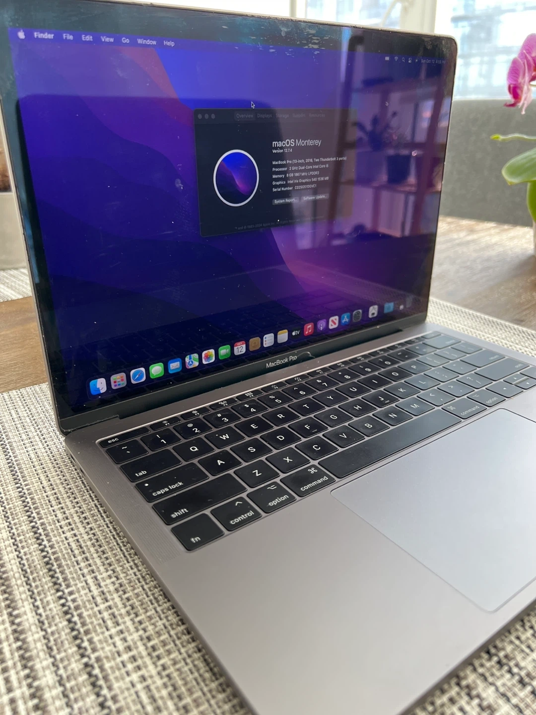 Selling a MacBook Pro 13-inch 2016 in very good condition, just a few scratches. It features the macOS Monterey operating system, 8 GB memory, 256 GB SSD storage and charger included. Feel free to reach out if you're interested