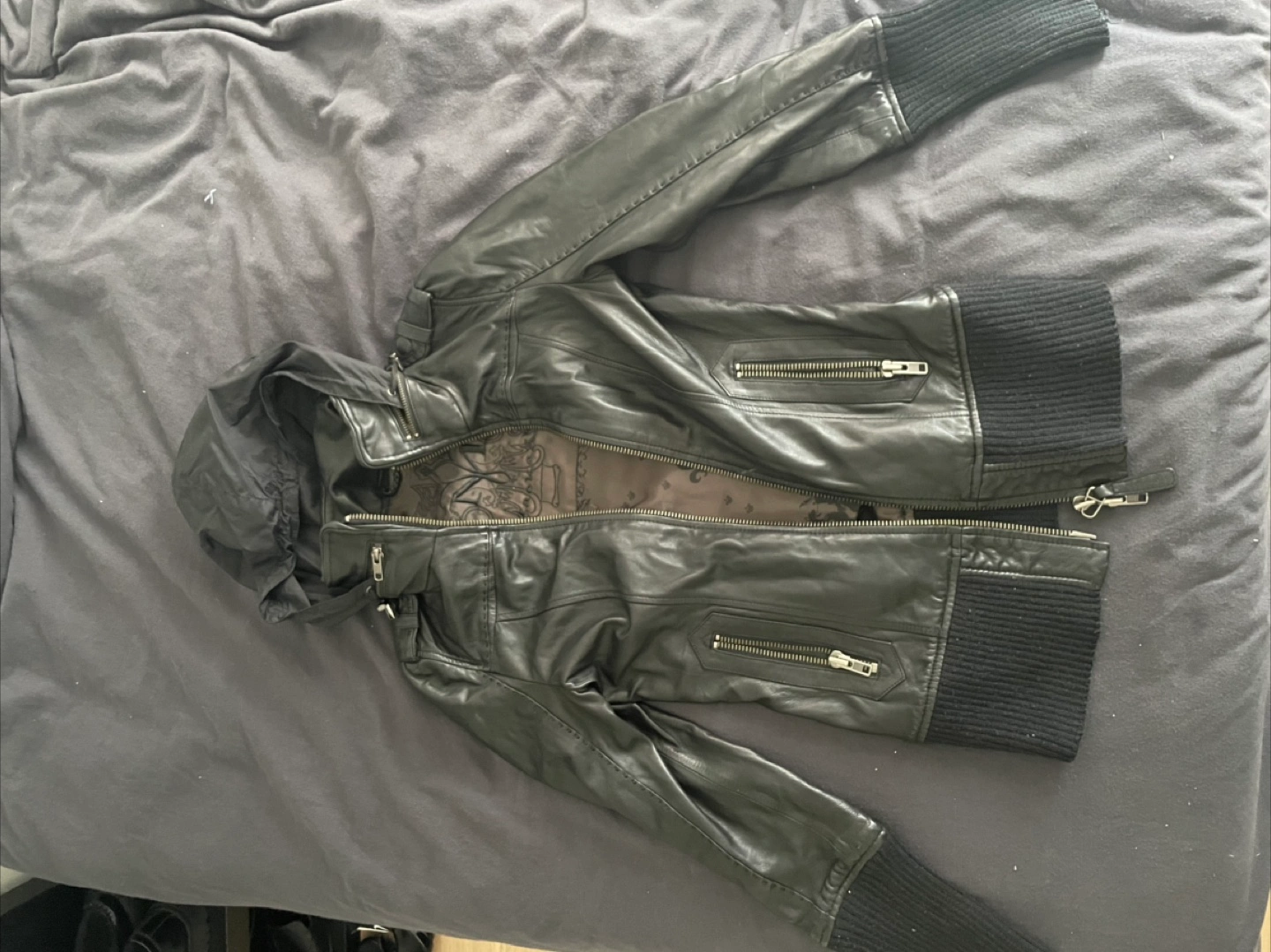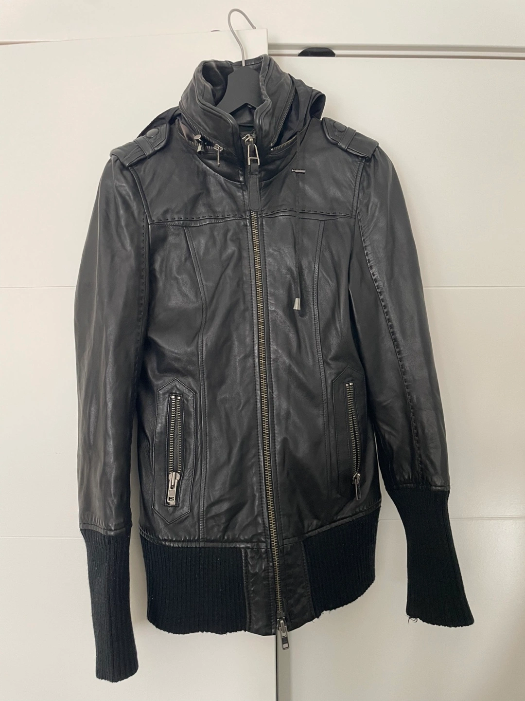 Selling a stylish black leather jacket from Mackage! It's in great condition and features a unique design with multiple zippers and a hood. Perfect for adding an edgy touch to your wardrobe