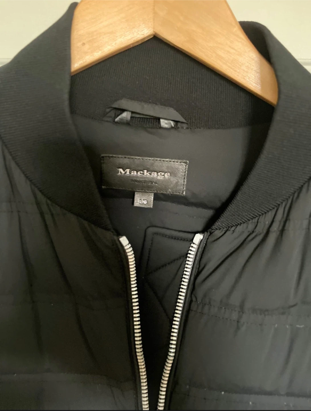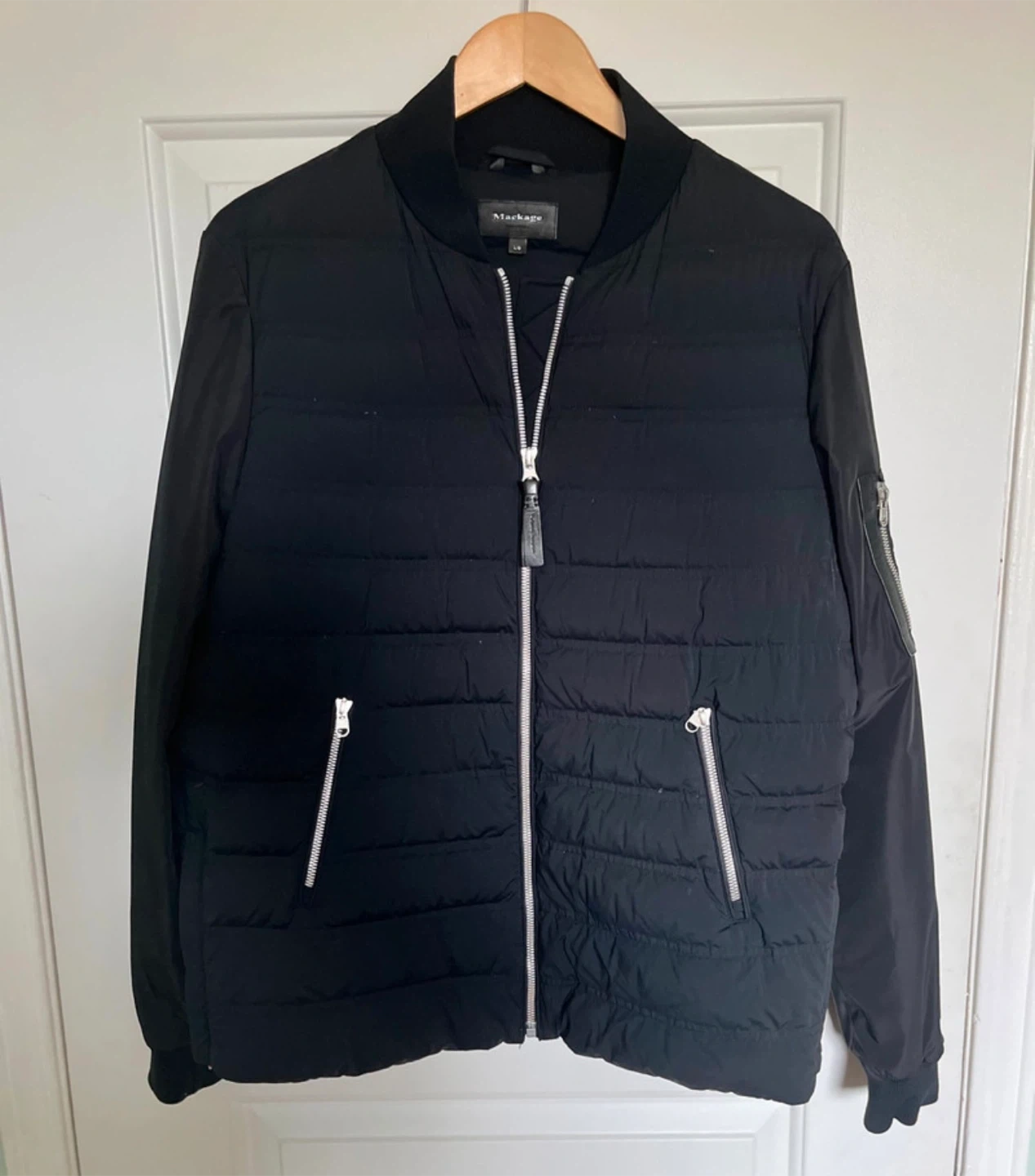 Selling a Mackage bomber goose down jacket in black, size large. It's in great condition and ready for a new home! Perfect for adding a touch of style to your wardrobe. Fits more like a M/L .