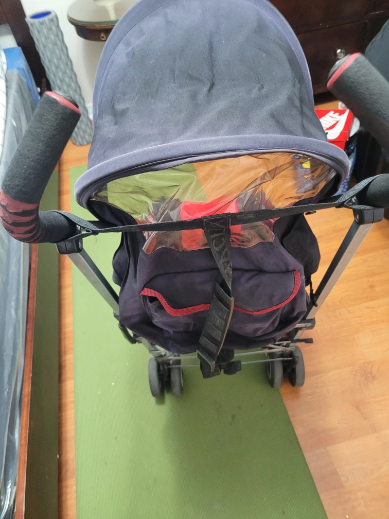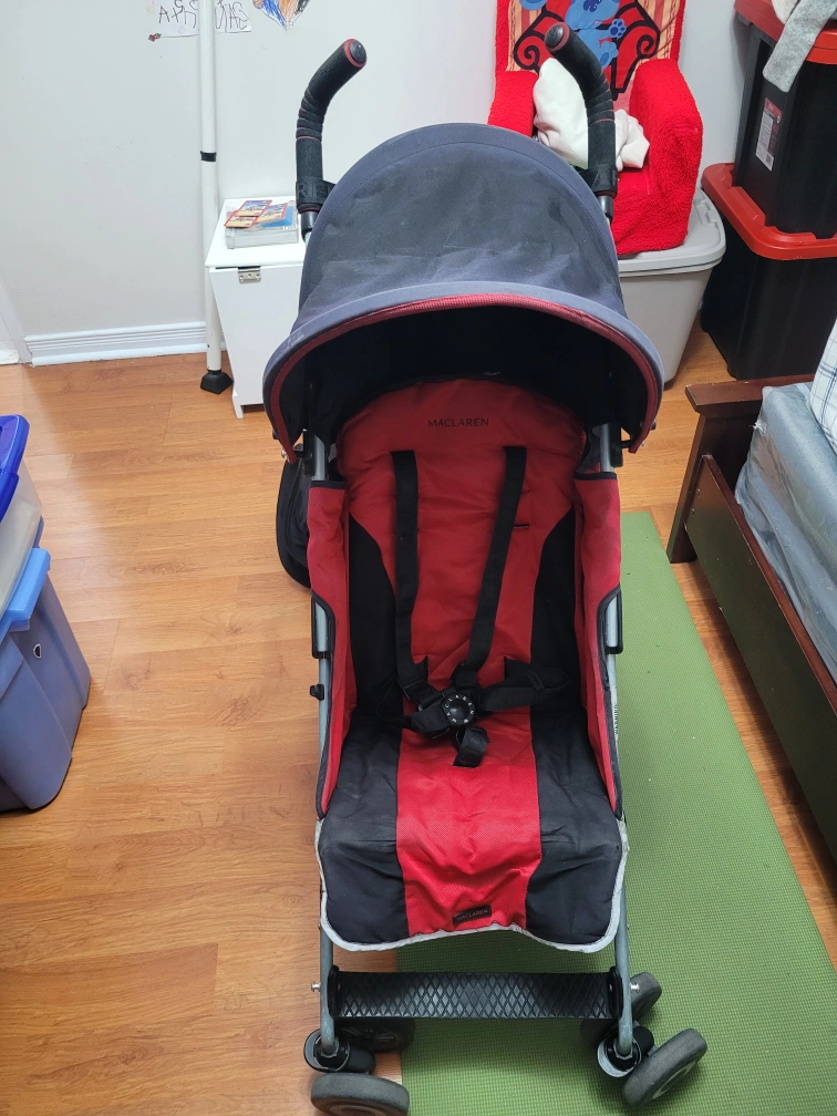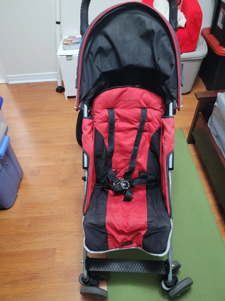 Selling a Maclaren stroller in red and black. It's in good condition and ready for your little one's adventures!