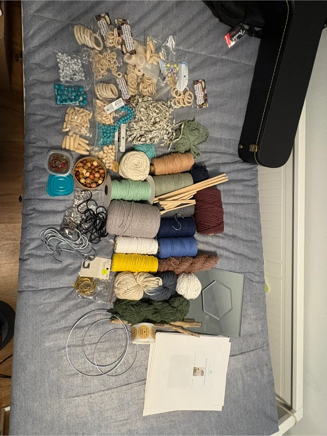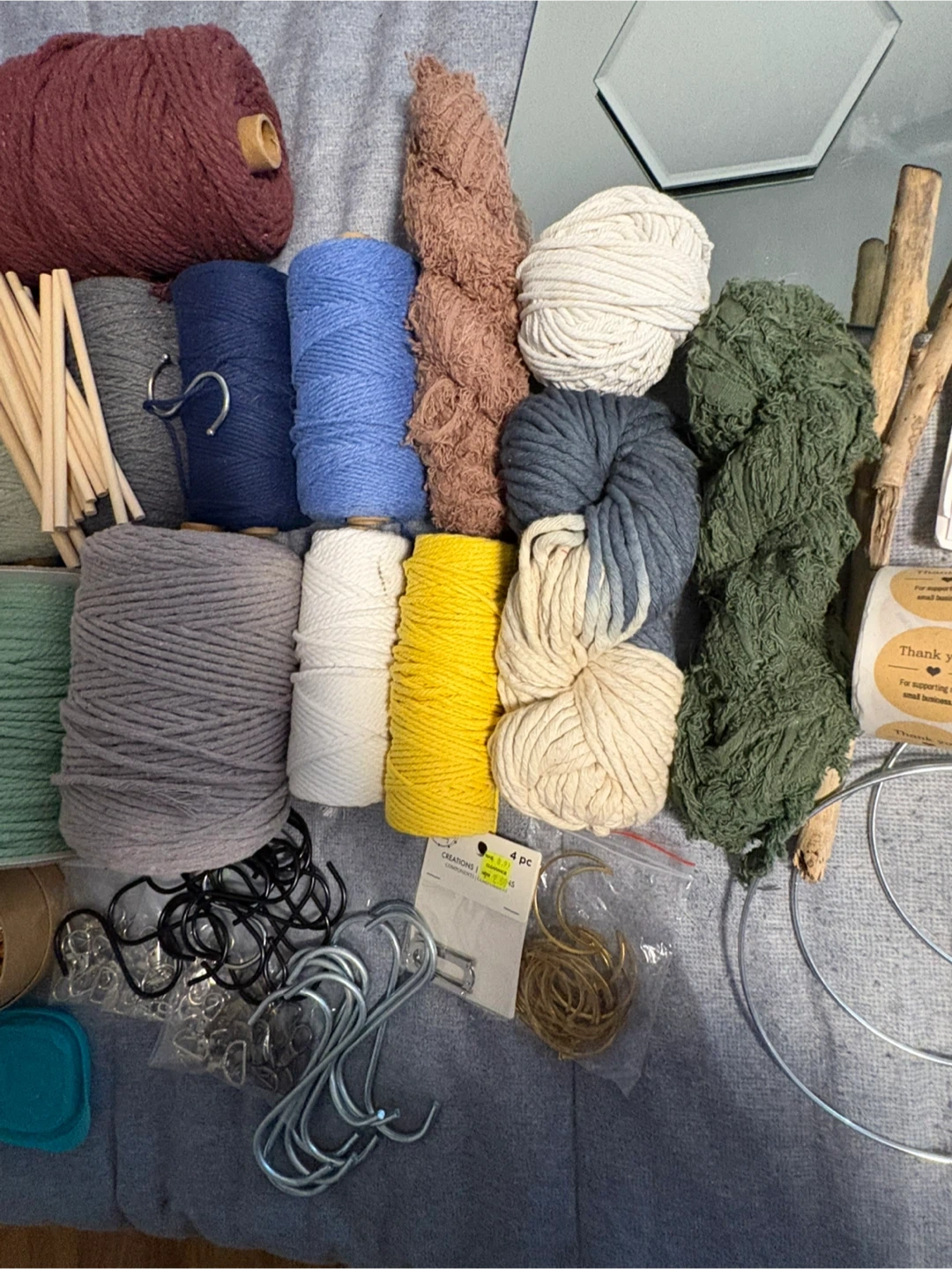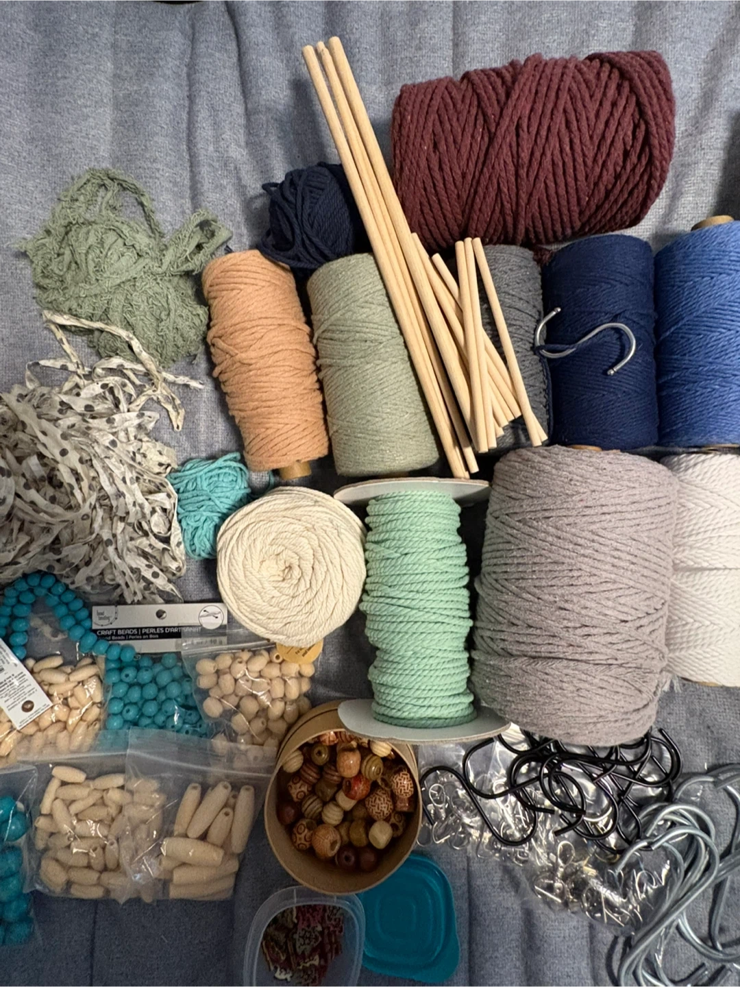 Selling a large lot of macrame crafting supplies! This includes a variety of colourful cords, wooden rings, beads (including some fun skull beads!), and other accessories to get you started on your next macrame project. Perfect for beginners or experienced crafters looking to expand their collection