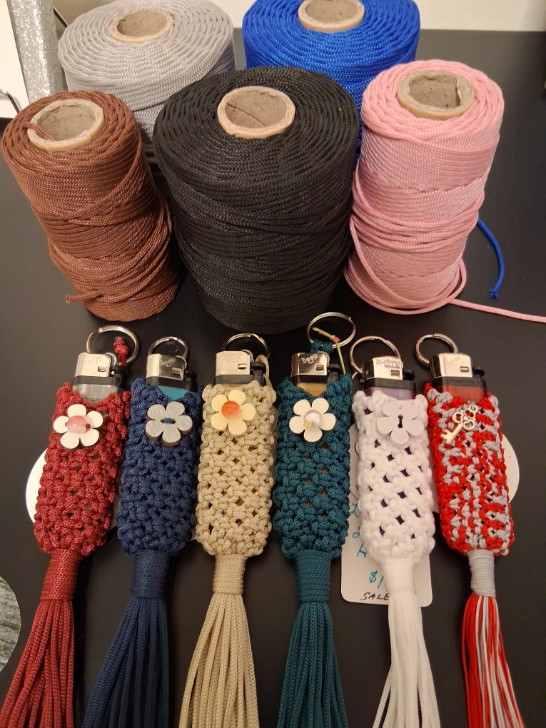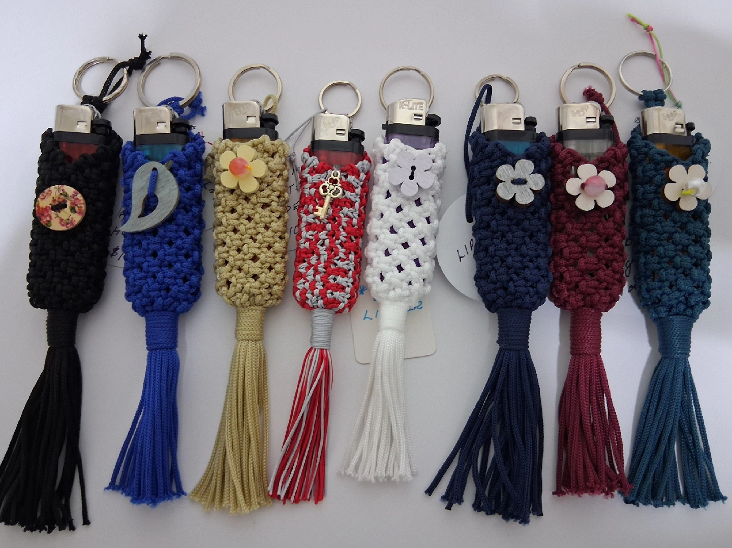 Handmade macrame Lip balm/lighter holder keychain. Available in 10 colours: burgundy, navy, tan, teal, white, rose pink, brown, black, gray, & royal blue. 'Red' is no longer available. Very popular item. Price $10. Pick up near GM Oshawa.