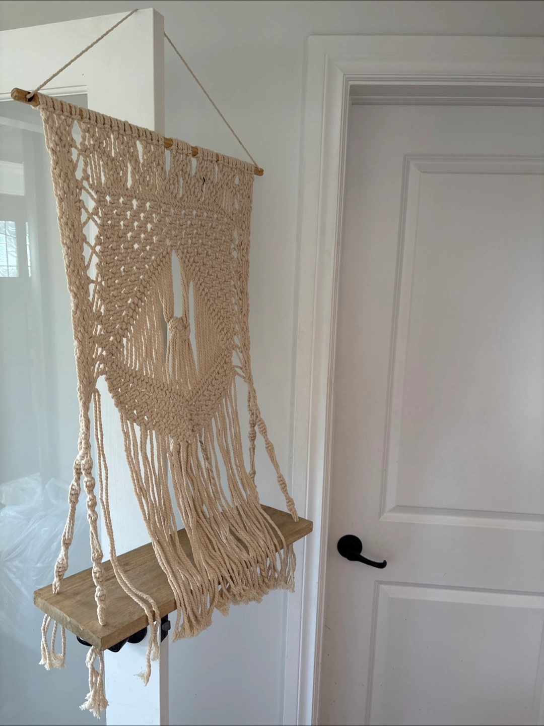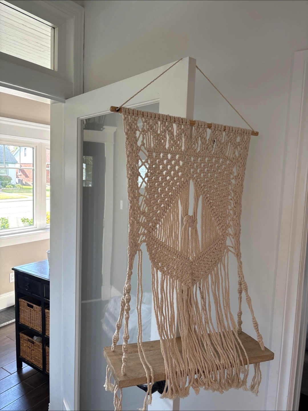 This charming macrame wall hanging shelf is perfect for adding a touch of bohemian style to your home. It features intricate macrame detailing and a sturdy wooden shelf, ideal for displaying plants, photos, or other small decorative items. It's in great condition and ready to bring a cozy vibe to any room $40 firm. Never used. No HOLDS. Pickup only