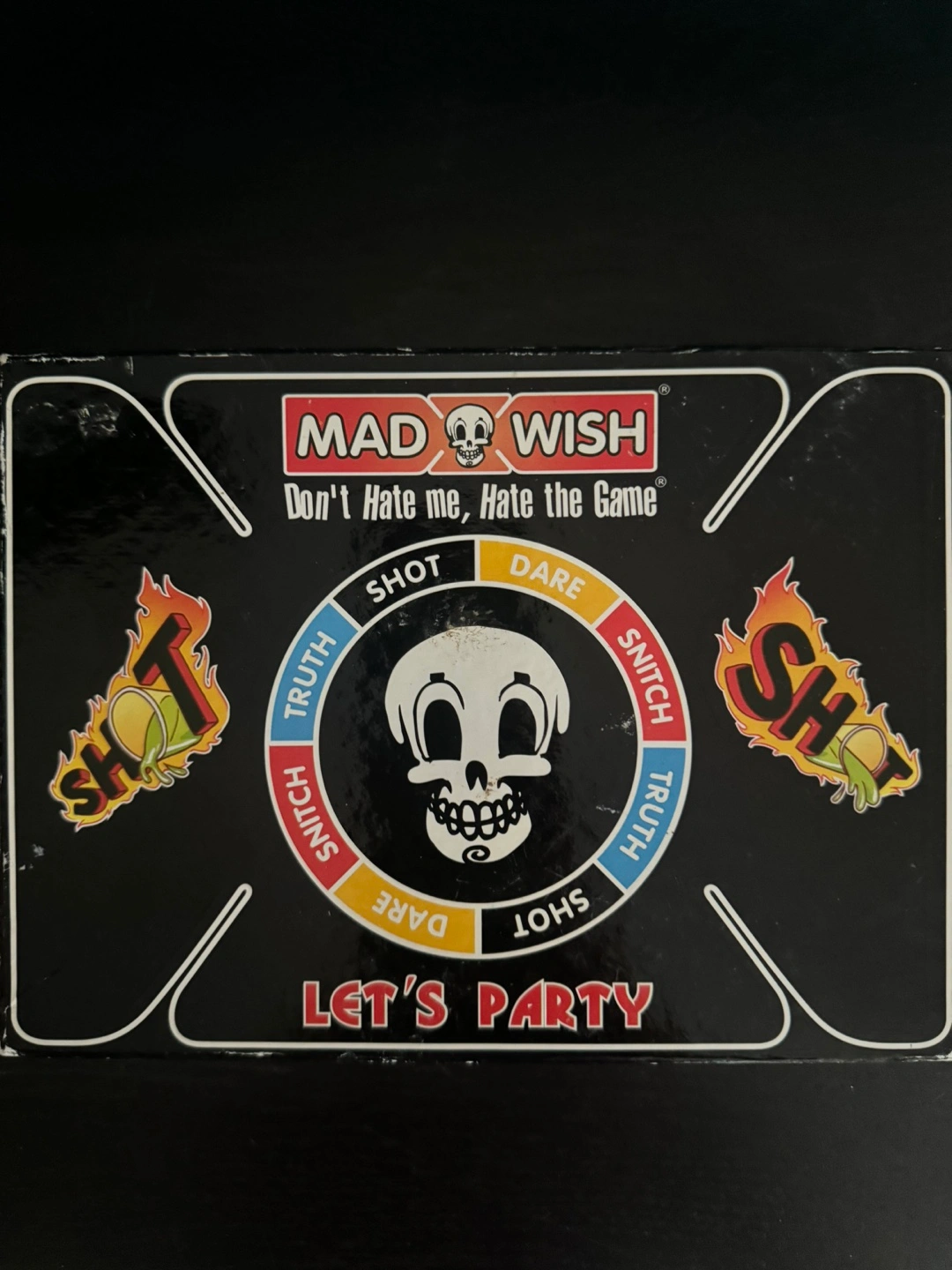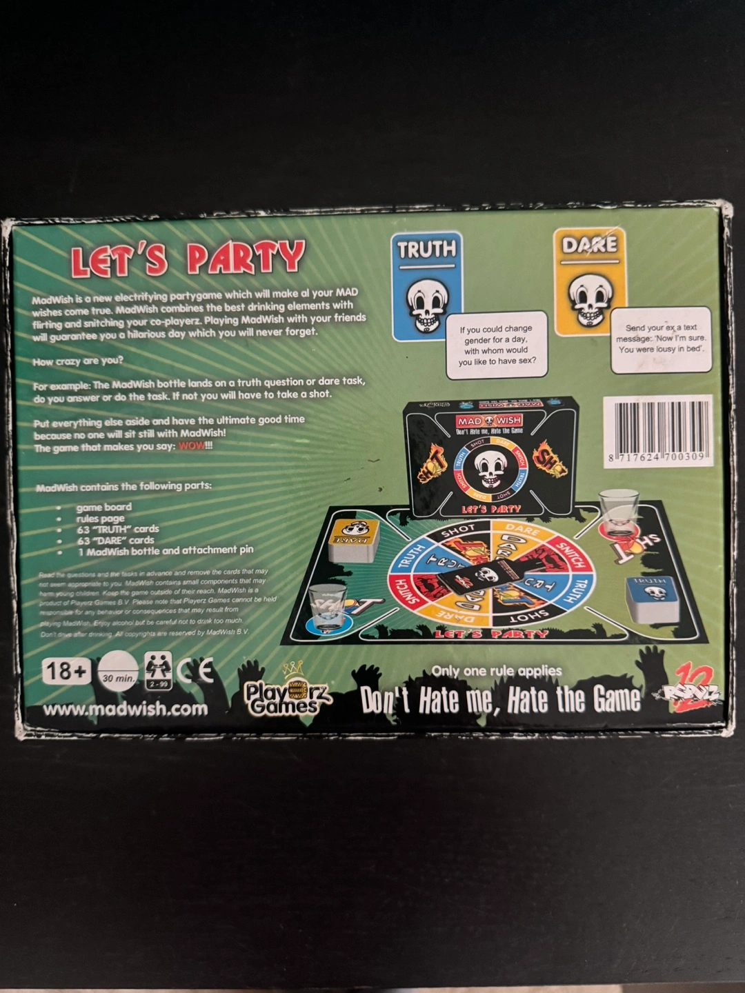 Party game. Includes a game board, cards, a spinner, and a shot glass. Comes with a miniature bottle of Beefeater gin. Includes dares, truths, and shots.