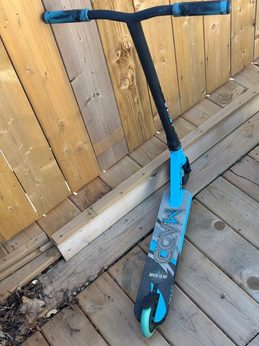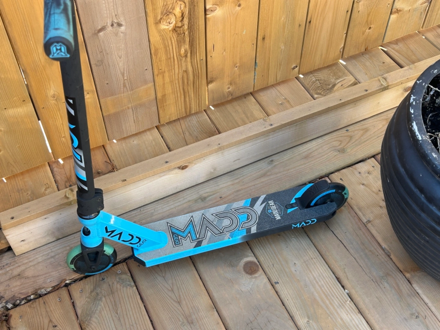 Used Madd Gear pro scooter. Excellent (never used)condition. Light blue and grey. Great for stunts and tricks. Durable frame and wheels.