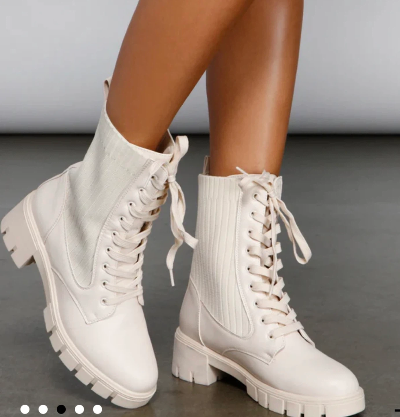 Selling a pair of Madden Girl combat boots in a lovely white colour! These boots are a size 8 and feature a lace-up design with a knitted sock detail around the ankle. They're in great condition and come with the original box