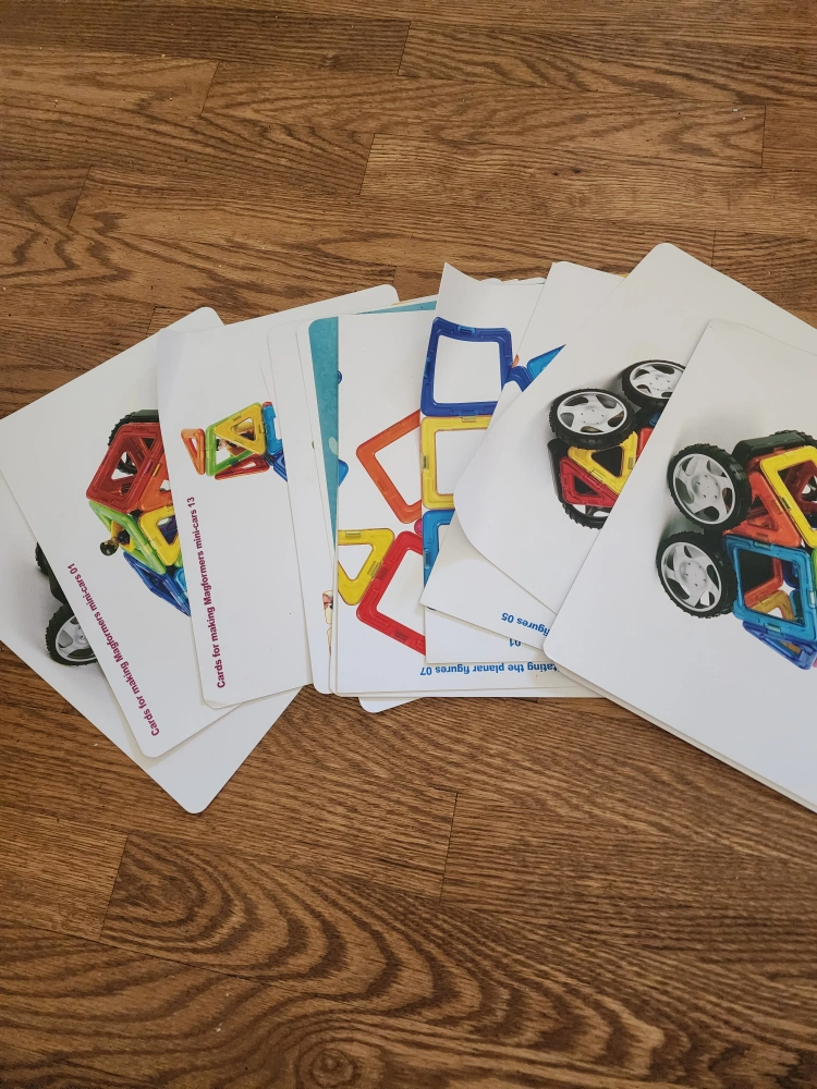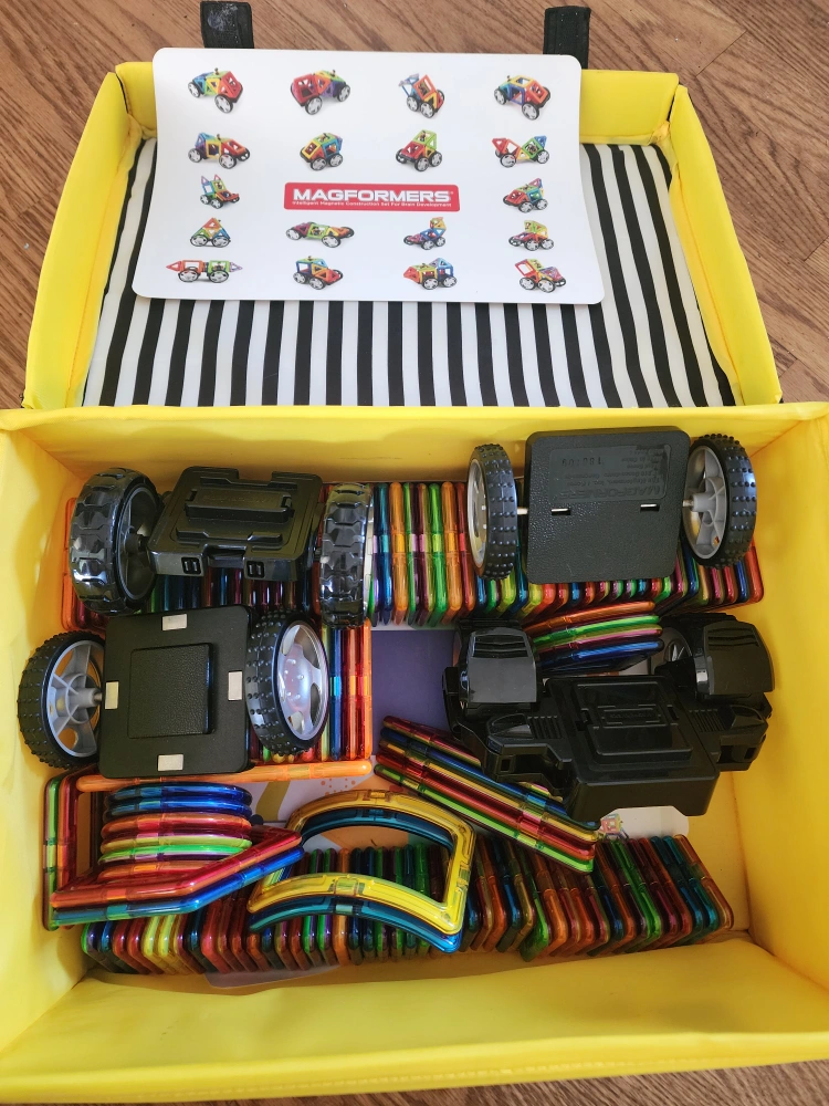Magformers magnetic construction set with a variety of shapes and wheels. Comes with idea cards, in a IKEA kids storage box