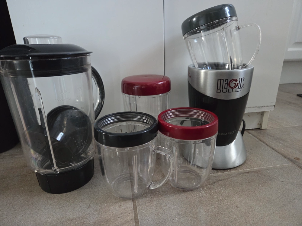 Selling a Magic Bullet blender. It comes with various cup sizes and lids, perfect for making smoothies or quick food prep! It's in great shape and ready for a new home