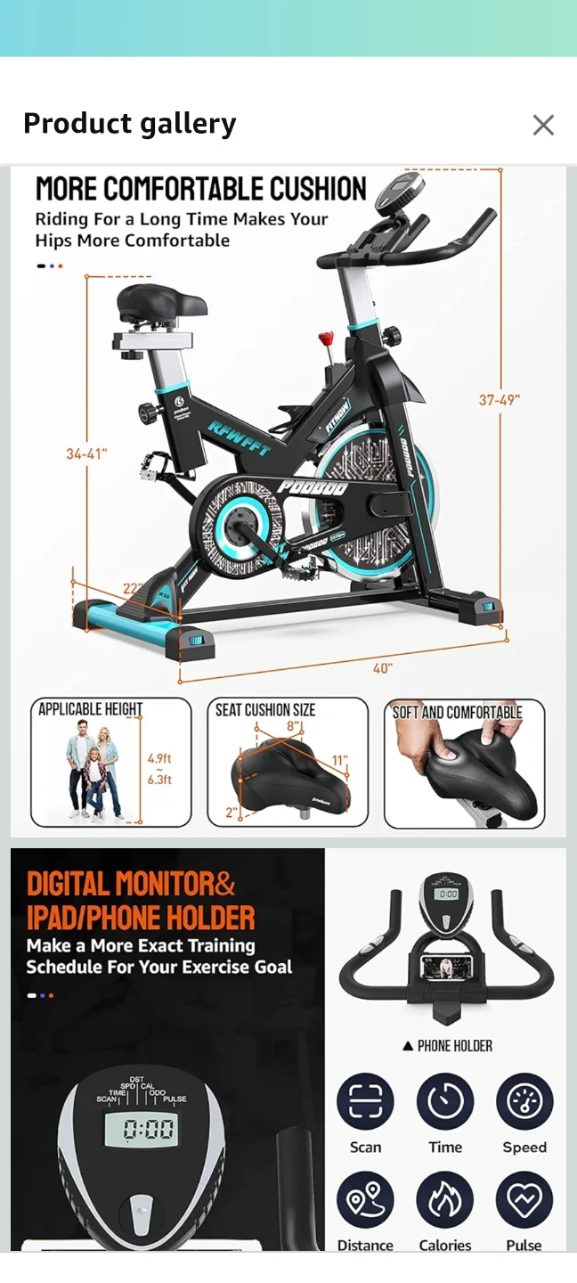 Indoor cycling bike. Comfortable cushion. Digital monitor and phone/iPad holder. Adjustable height.