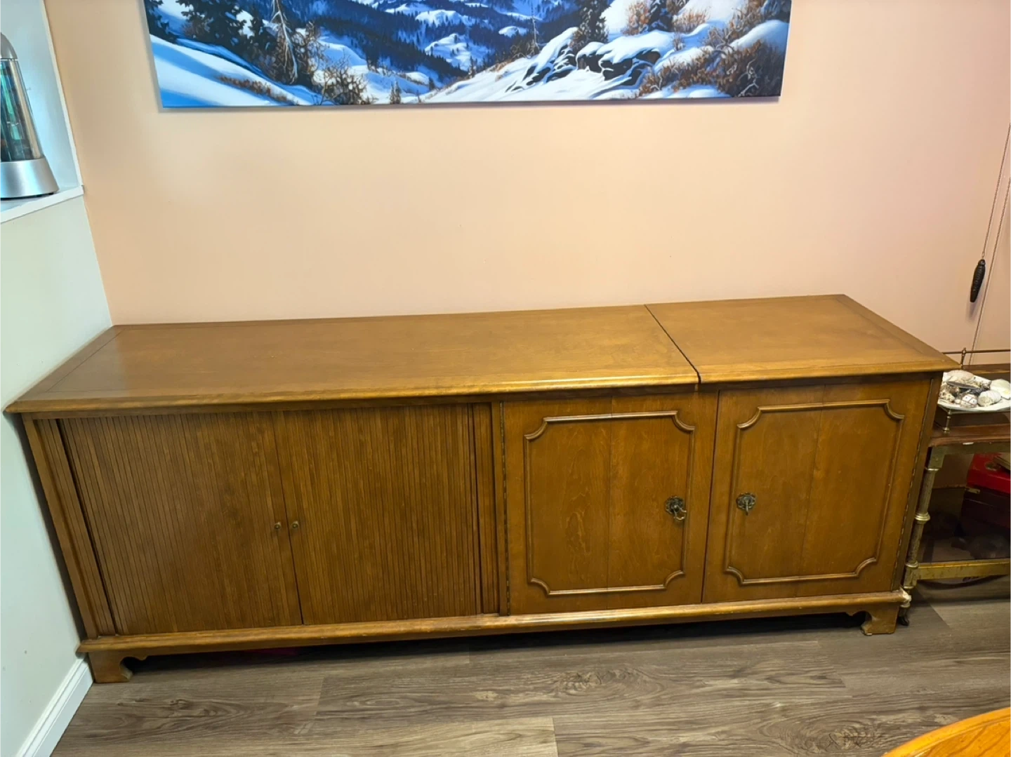 Selling solid Mahogany Dining room table seats 8 fully extended picture is 72 inches partial extension and matching Credenza It has plenty of storage space with cabinets and shelves. Perfect for adding some character to your dining or living room! Cradenza L-79 W-20 H-29.5 inches Pick up only