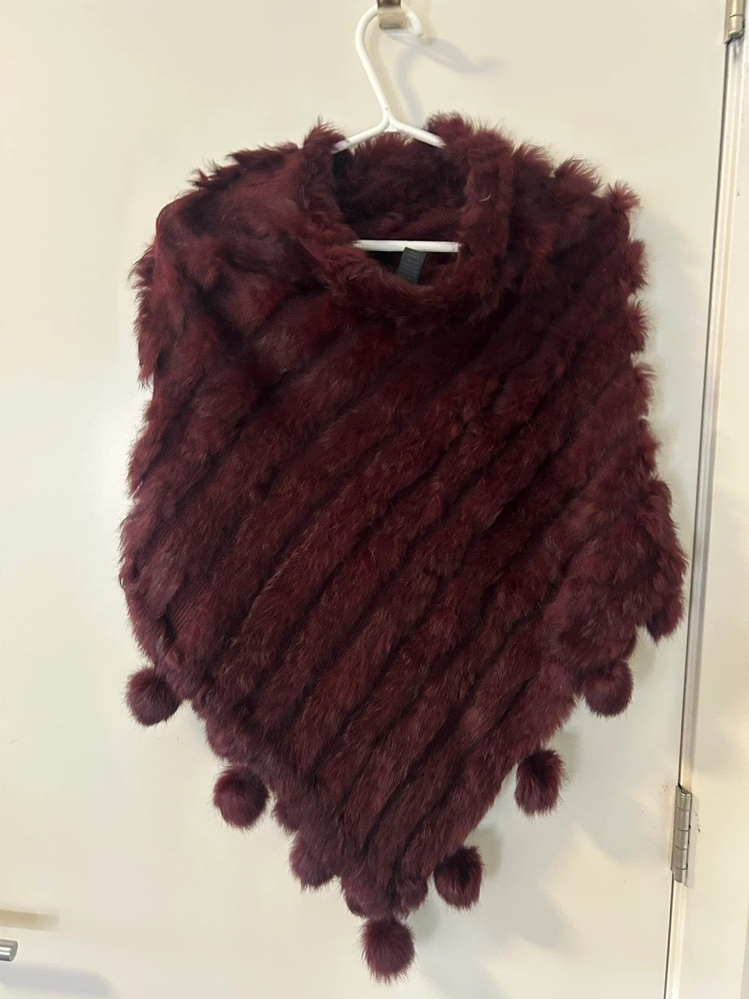 Selling a Maison Cinqcent poncho in a lovely burgundy colour! It's a one-size-fits-all and has a unique design with pom-poms around the edges. It's super cozy and perfect for adding a touch of elegance to any outfit
