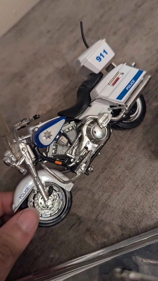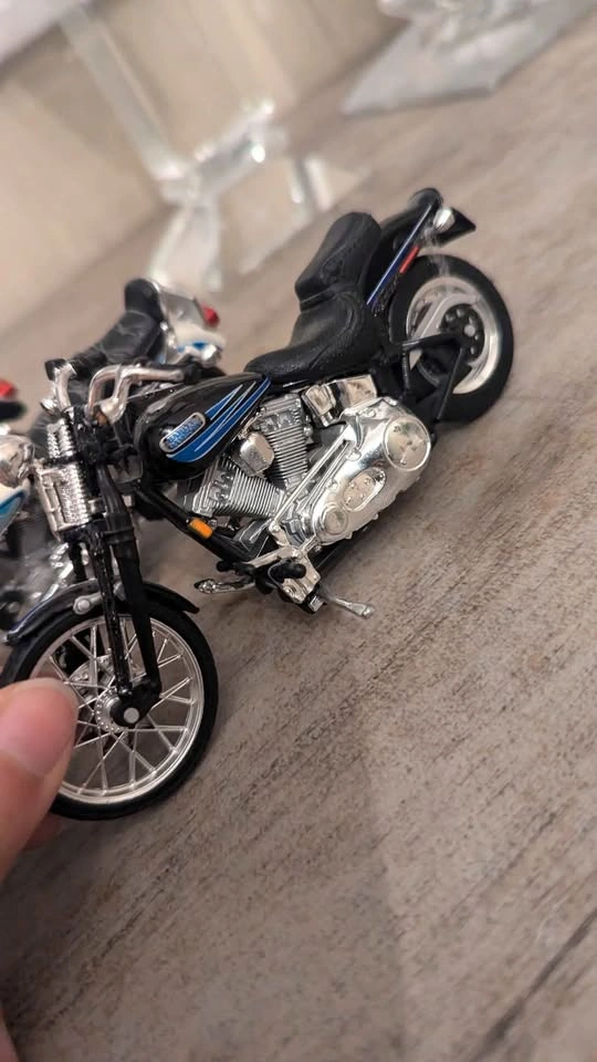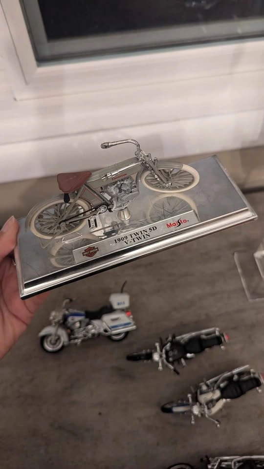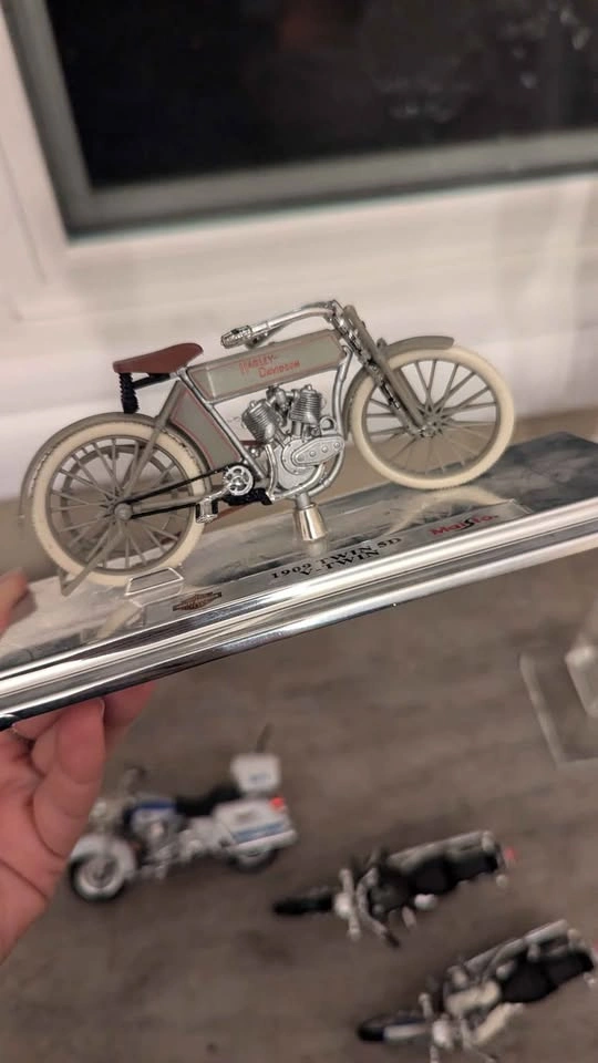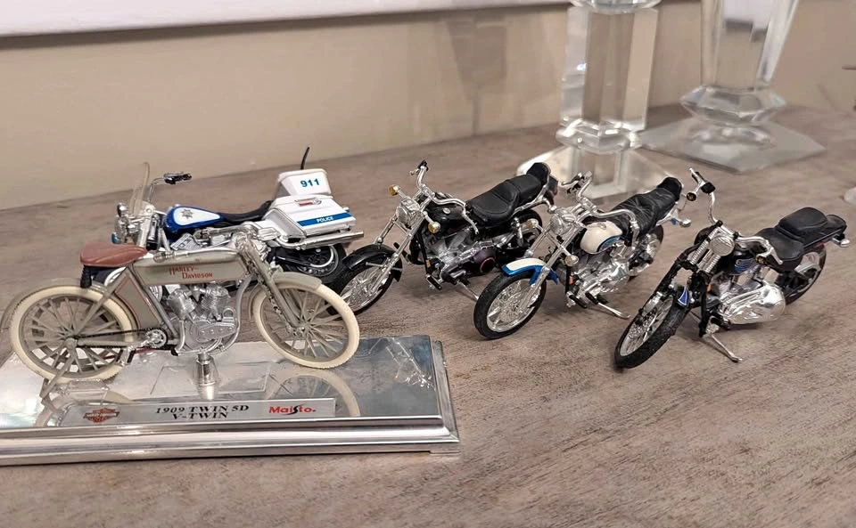 Prefer to sell all together - $50 all - no boxes, good overall condition, haven't noticed any defects besides missing kickstand on 911 bike. - sold as is - 1. Maisto Harley-Davidson 1909 Twin 5D V-Twin (display stand model) 2. Maisto Harley-Davidson Police / Law Enforcement Replica (911-marked, **broken kickstand) 3. Maisto Harley-Davidson Cruiser / Custom – Black / Blue scheme 4. Maisto Harley-Davidson Cruiser – Cream & Blue color version 5. Maisto Harley-Davidson Custom / Chopper style