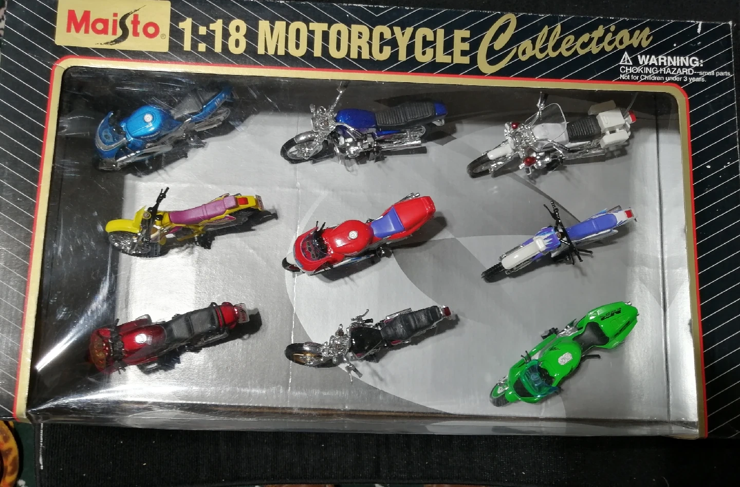 Selling a Maisto 1:18 scale motorcycle collection. The set includes a variety of motorcycle models in different colours. The motorcycles are still in their original packaging.