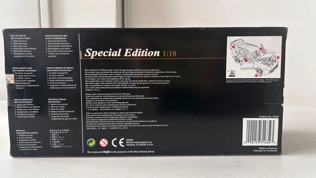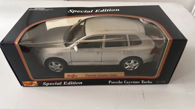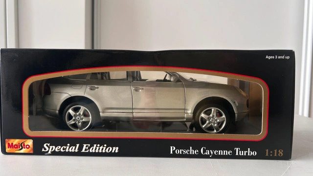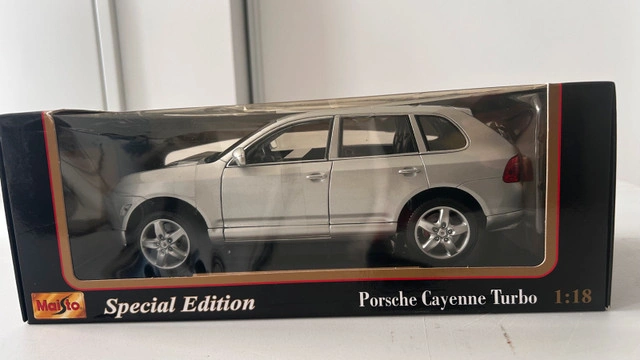 Check out this Maisto Special Edition 1:18 scale diecast model of a Porsche Cayenne Turbo, perfect for collectors and car enthusiasts alike. This detailed replica captures the sleek design of the Cayenne Turbo, making it a great addition to any display or collection. The item is in excellent condition and comes in its original packaging, ensuring its pristine state. The car is silver in colour. Specifications: * Brand: Maisto * Scale: 1:18 * Model: Porsche Cayenne Turbo * Edition: Special Edition If you're reading this, it's still available! So, don't miss out on the chance to own this fantastic model car. It's ready to roll into your collection and bring a touch of automotive elegance to your space!