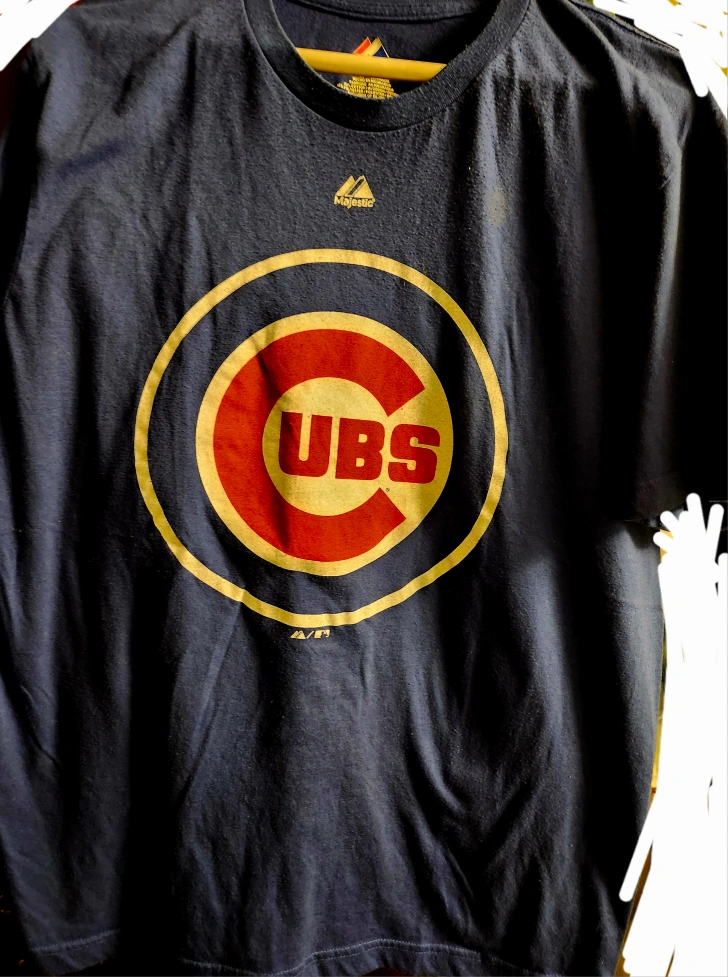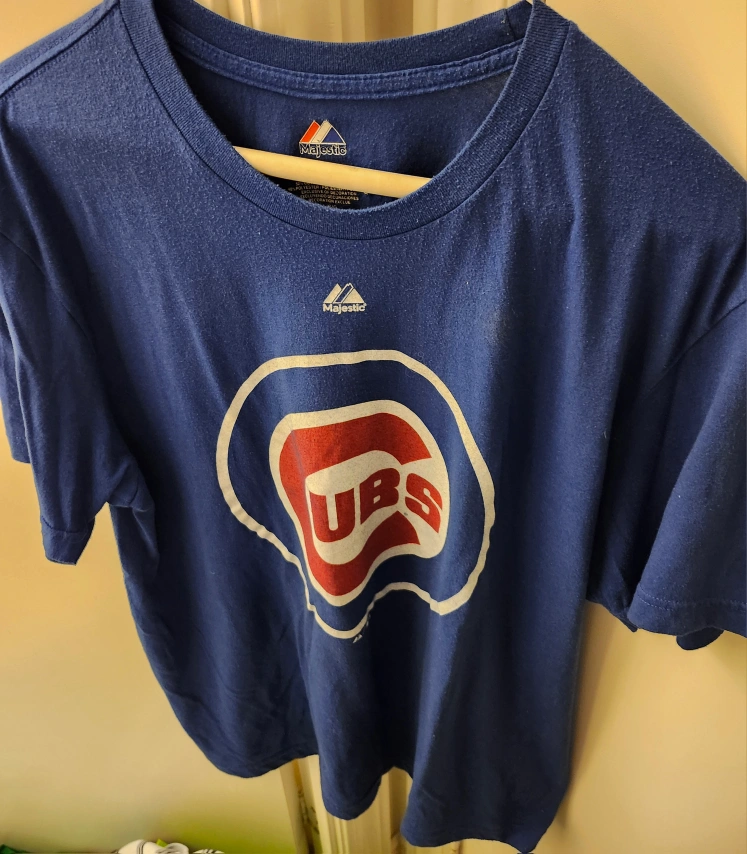 Selling a Majestic brand Chicago Cubs t-shirt. It's a size large and made of 52% cotton and 48% polyester. The shirt features the Cubs logo on the front. Perfect for any Cubs fan! mens