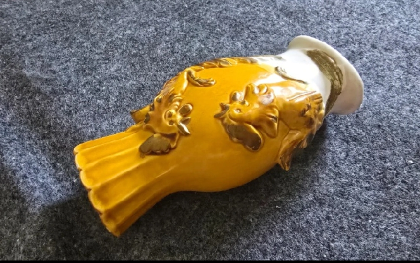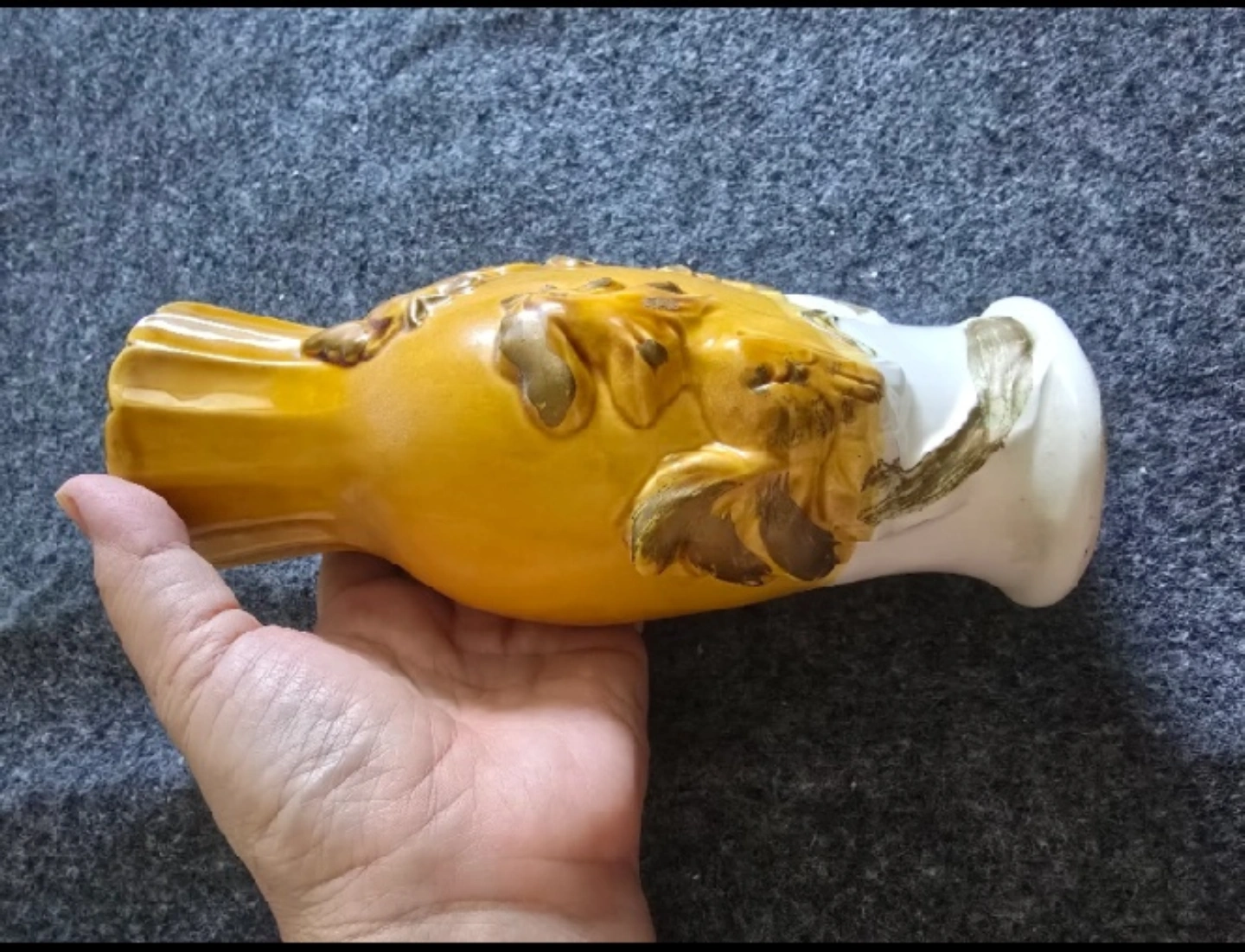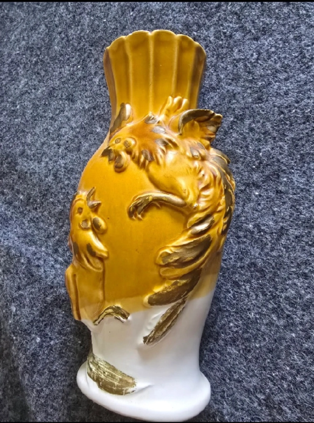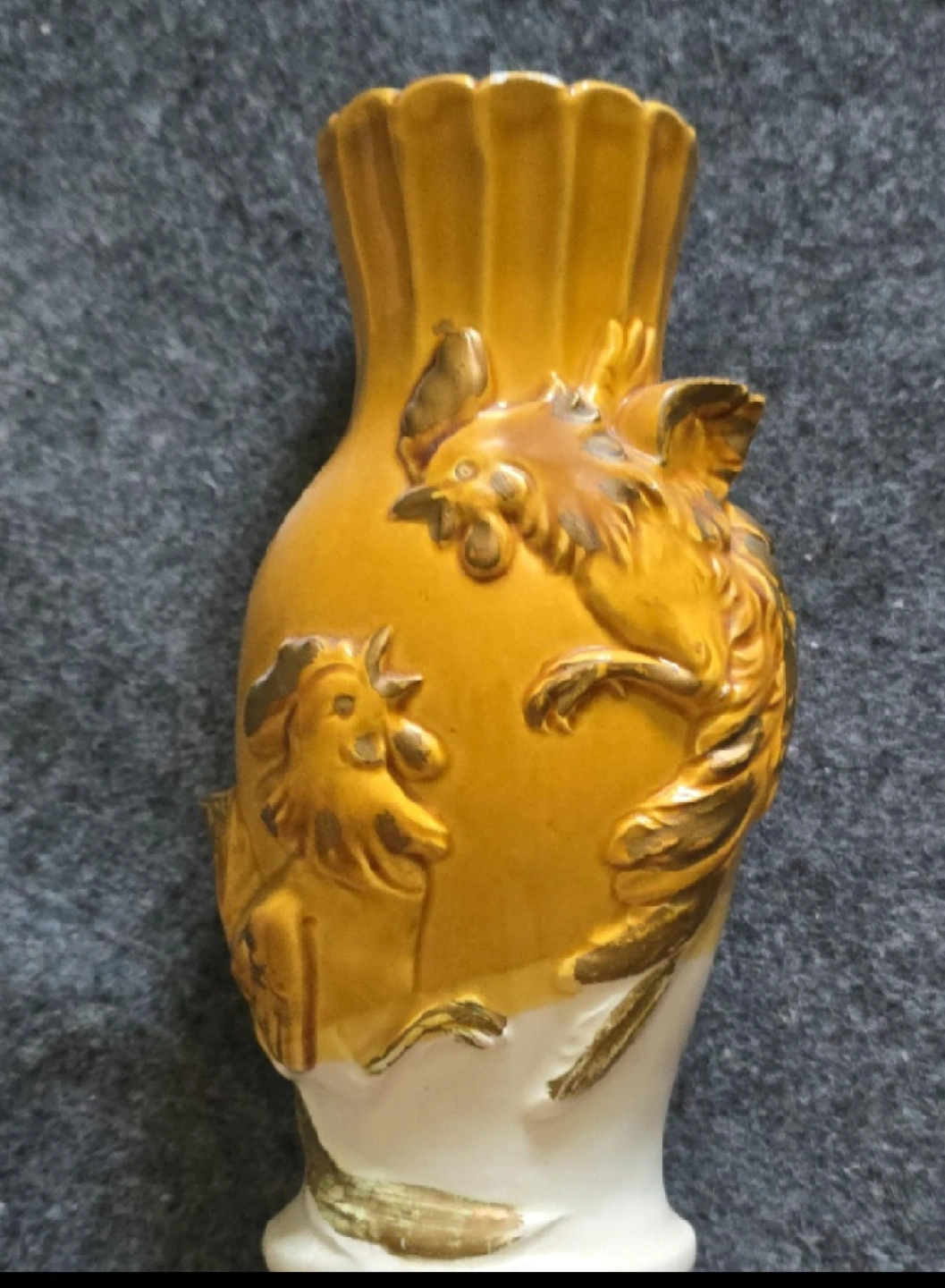 I'm offering a beautifully yellow mustard and white glazed Majolica vase. There are raised rooster details around the body. It is sure to be the perfect good luck addition to your kitchen /L8ving room display. Rare in form of vase. Commonly seen in Pitcher but not in vase form. Details in photos. . šM1R1S1 near Esso