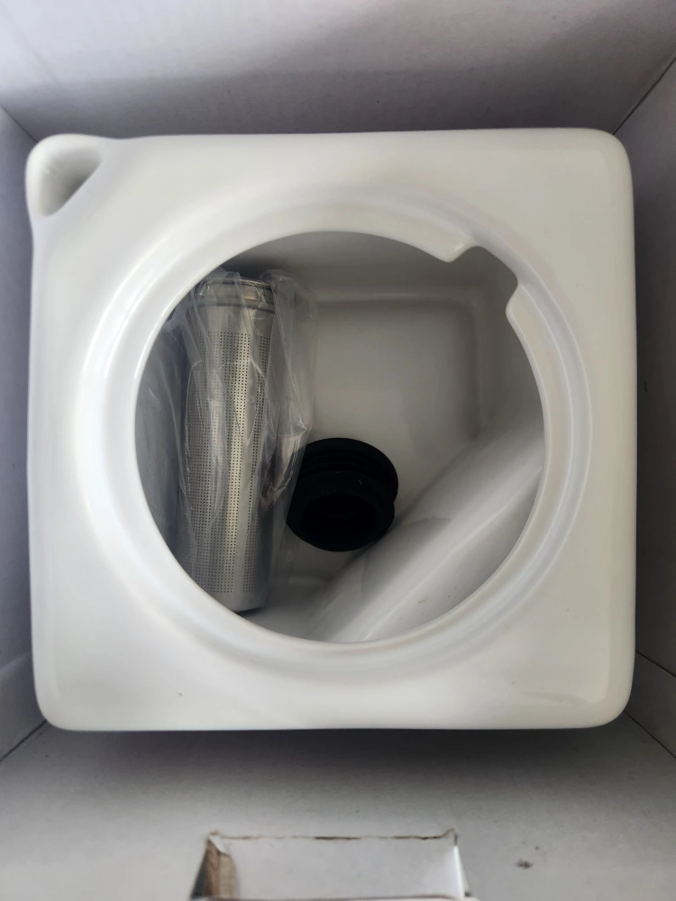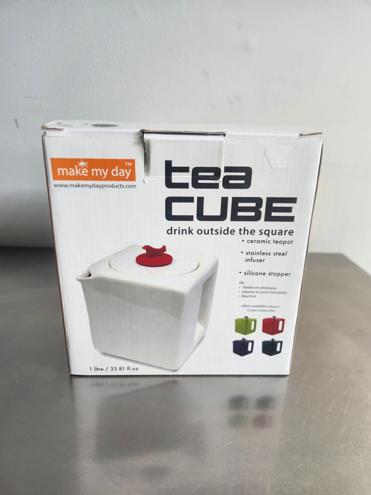 Brand new, unopened Make My Day Tea Cube teapot. Ceramic teapot with stainless steel infuser and silicone stopper. One litre capacity. White teapot with black stopper.