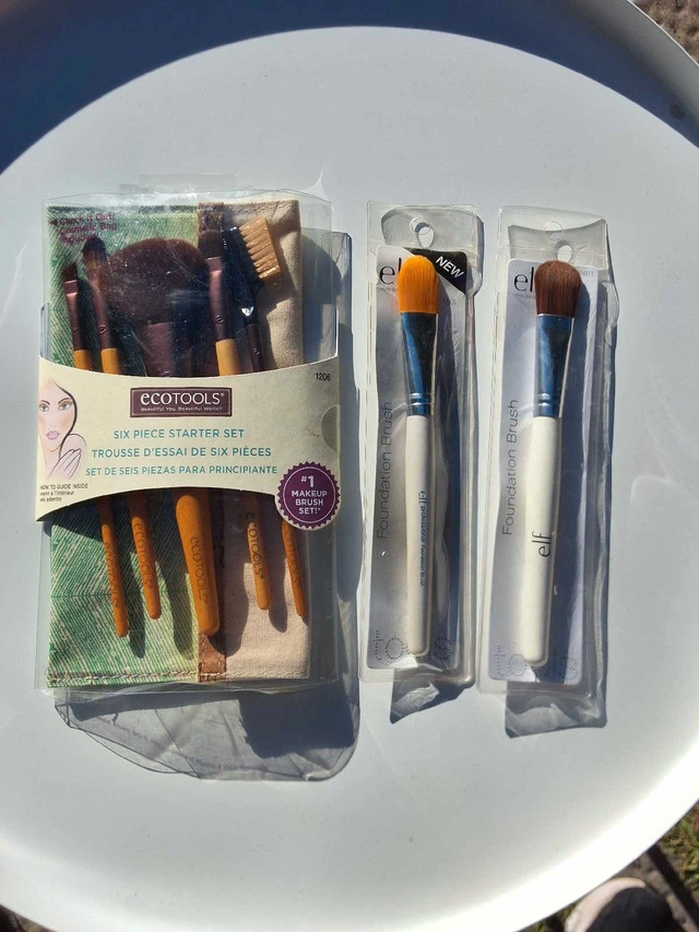 All new, never used, in package. Includes Eco Tools brush set with cosmetic bag (concealer brush, blush brush, eye shading brush, angled eyeliner brush, lash & brow groomer) and two Elf foundation brushes. $5 for the lot. See our other ads.