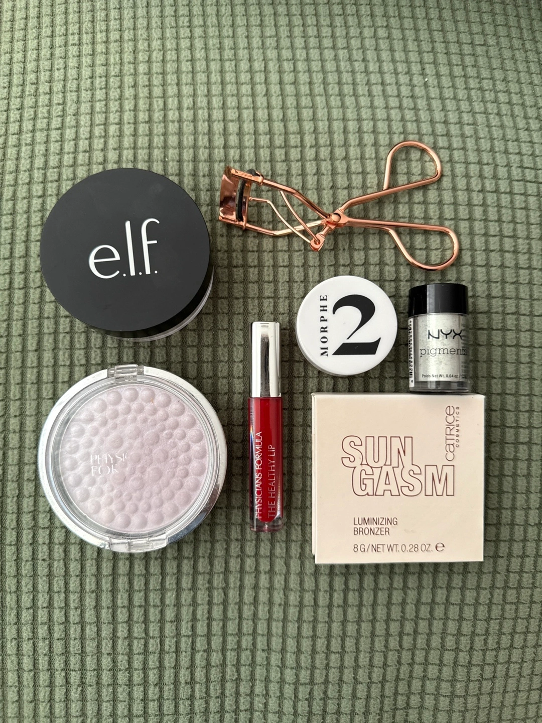 Makeup bundle including Elf setting powder, NYX pigment, Physicians Formula highlighter, Catrice bronzer, Morphe liquid eyeshadow and rose gold eyelash curler.