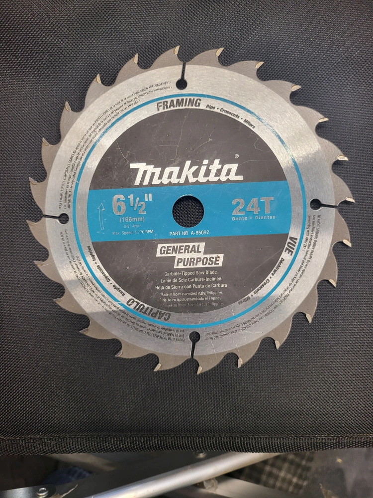 Selling a Makita 6 1/2 inch saw blade with 24 teeth! This is a general purpose blade, perfect for framing, ripping, crosscuts, and miters. It's carbide-tipped for durability and made in Japan, assembled in the Philippines