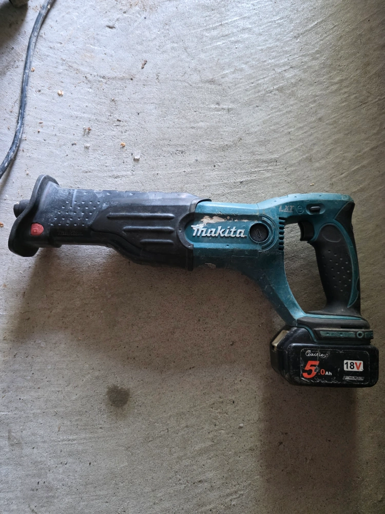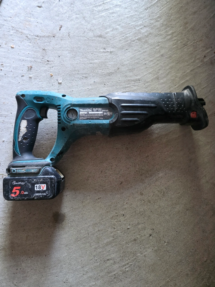 Selling a used Makita reciprocating saw, model DJR182. It's in working condition, as shown in the pictures. The battery is included and shows 65% power. No charger included