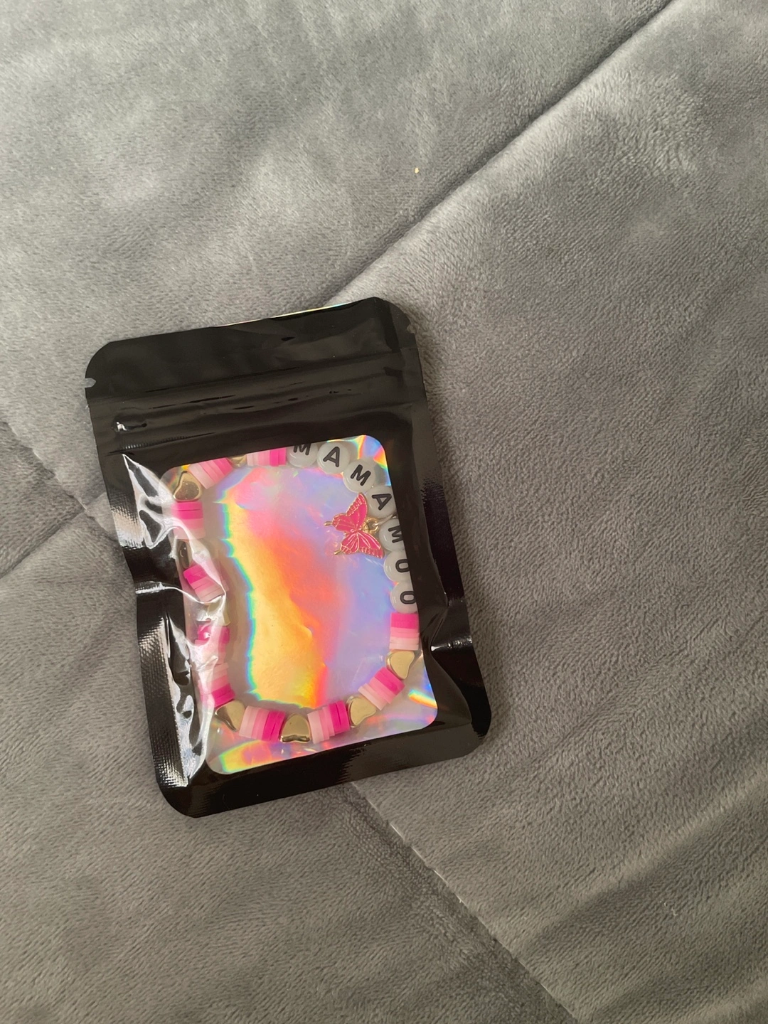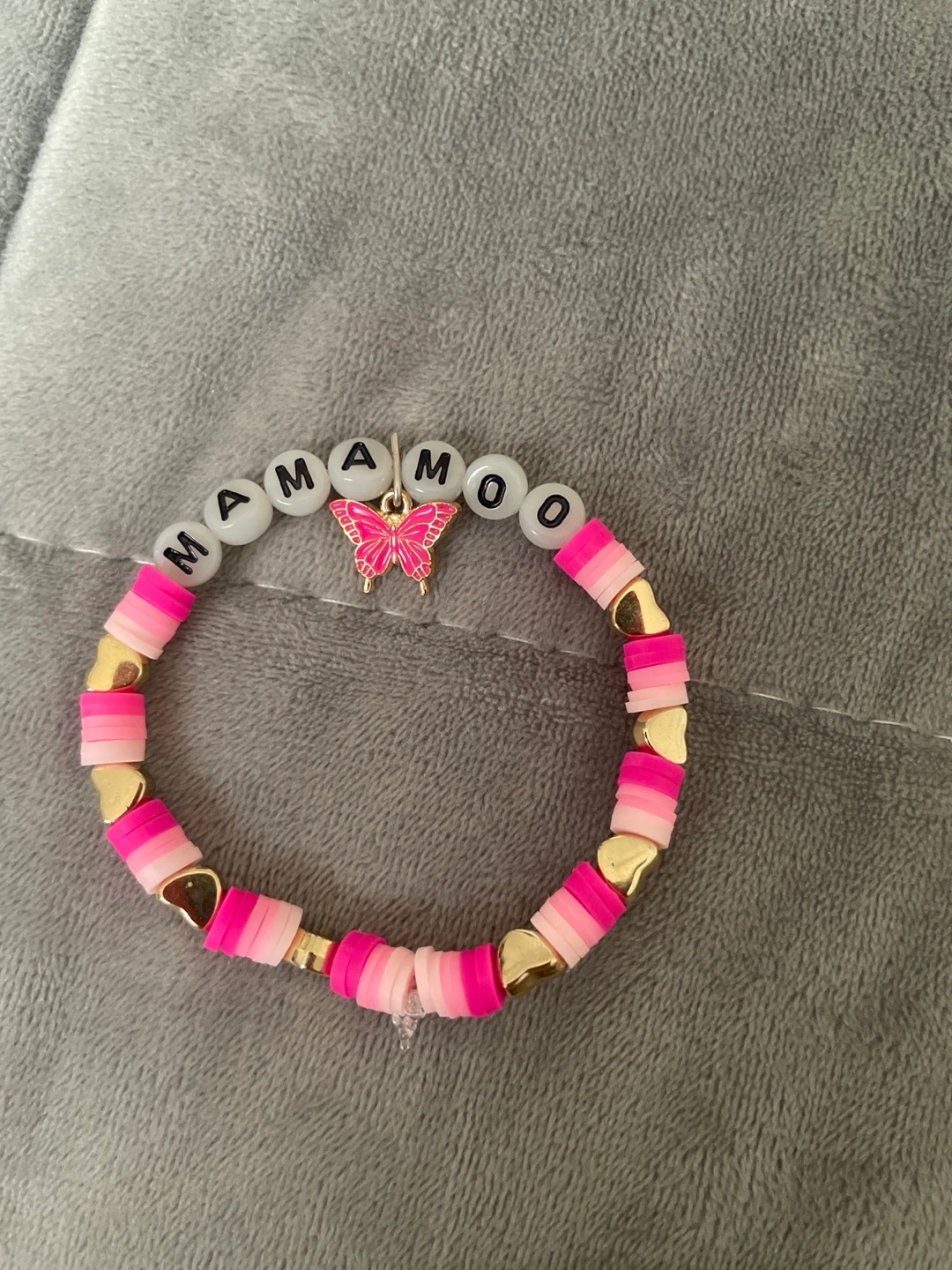 Selling a cute MAMAMOO themed bracelet! It features pink and gold beads with a butterfly charm. Perfect for any fan