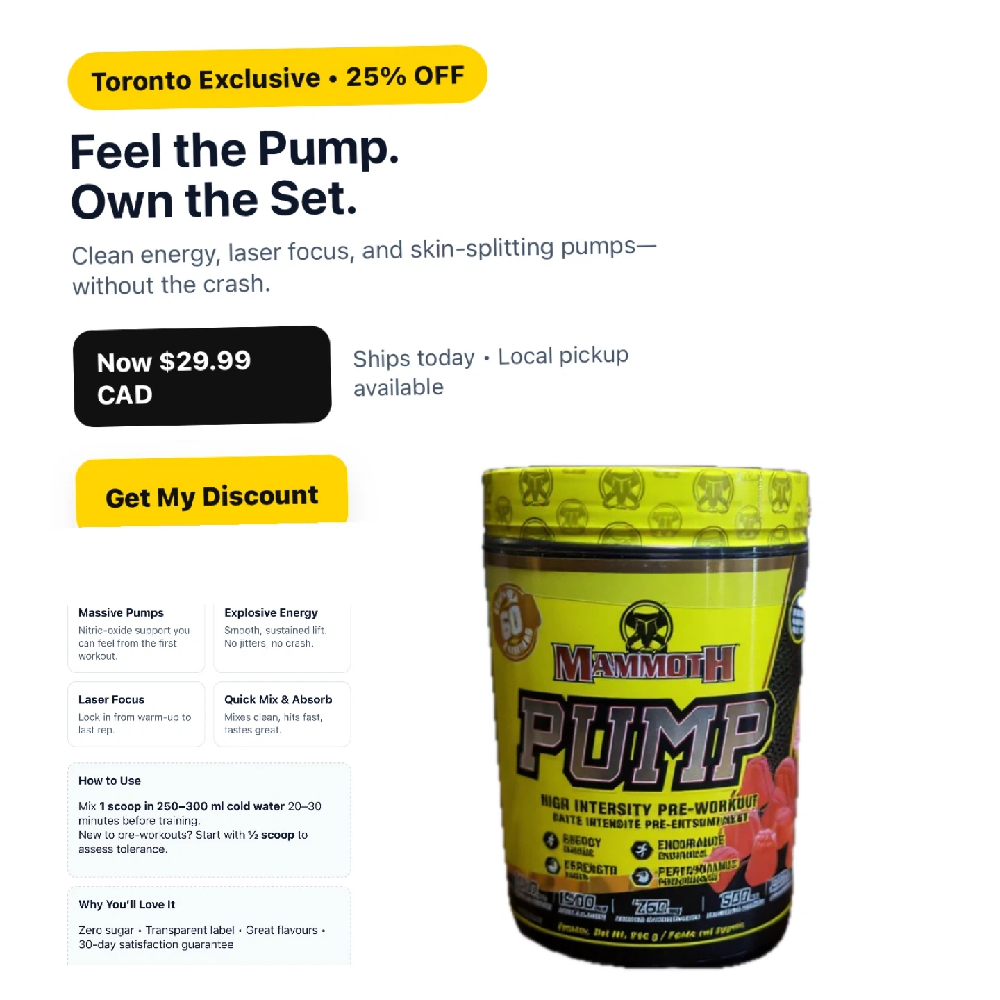 Feel the pump with Mammoth Pump pre-workout! This intensity pre-workout mix is designed for clean energy, laser focus, and skin-splitting pumps, all without the crash. Mix one scoop in 250-300 ml of cold water 20-30 minutes before training. Start with 1/2 scoop to assess tolerance. It's zero sugar, transparent label, and great flavours!