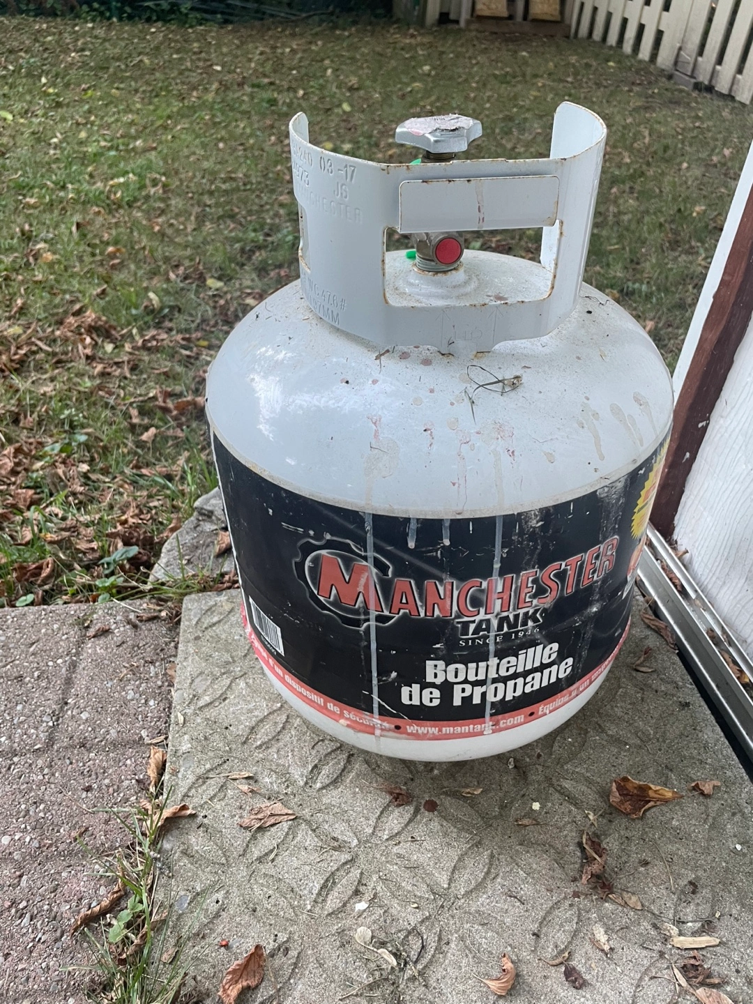 Selling a Manchester propane tank. It appears to be in used condition, as shown in the photos. The tank has some visible wear and tear, but is still functional.