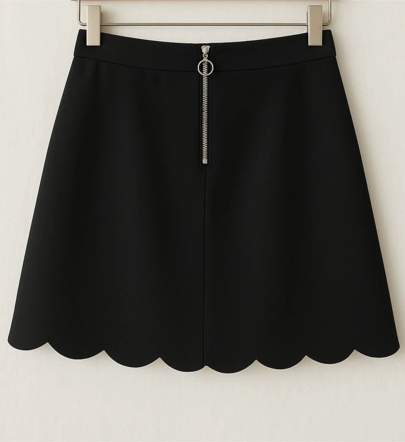 ✨ Elegant and stylish black skirt from MANGO • Size: (add your size — XS • Condition: Excellent / Like New • Features: Eye-catching scalloped hem, silver front zipper with ring pull, and flattering A-line shape • Style: Chic and versatile — perfect for work, dinner, or a night out • Material: Smooth woven fabric with slight stretch 🚭 Smoke- and pet-free home
