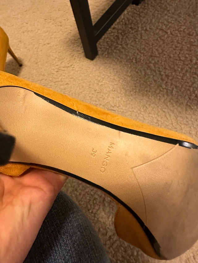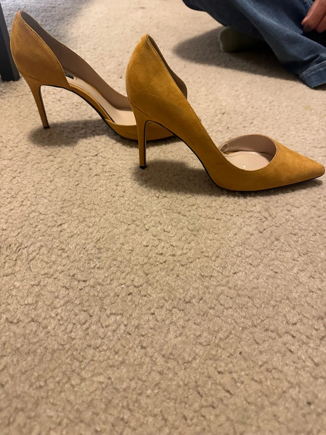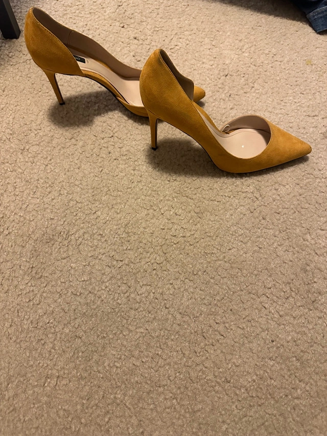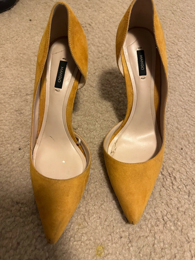 Lovely yellow suede heels, I usually pair them with a crisp white shirt and light faded pants or jeans. Selling as I can’t wear heels anymore. Black marks on heels recorded in photos, should be easy to get off. Three inch heels.