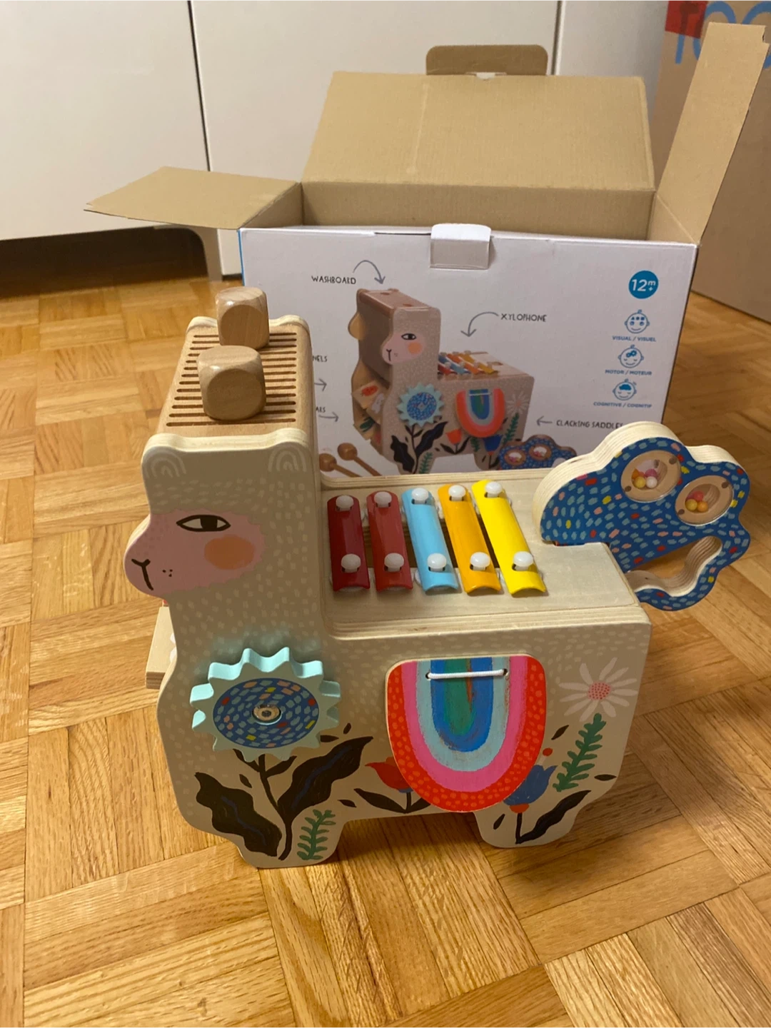 Selling a gently used Manhattan Toy Musical Lili Llama activity toy! It's a super cute and fun toy for little ones. Comes with the original box. It includes a xylophone, washboard, guiro, clacking saddle and mallets. Recommended for ages 12 months and up