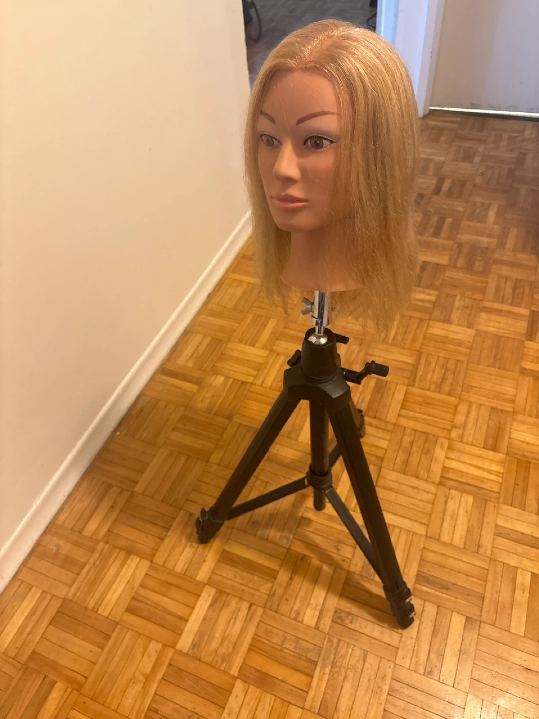 Selling a mannequin head with blonde hair, complete with a sturdy tripod stand. Perfect for cosmetology students or anyone practicing hairstyling techniques. The mannequin head is in good condition and ready for a new home!