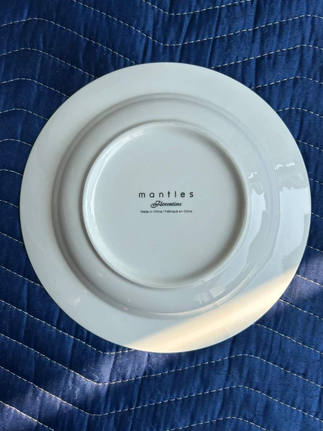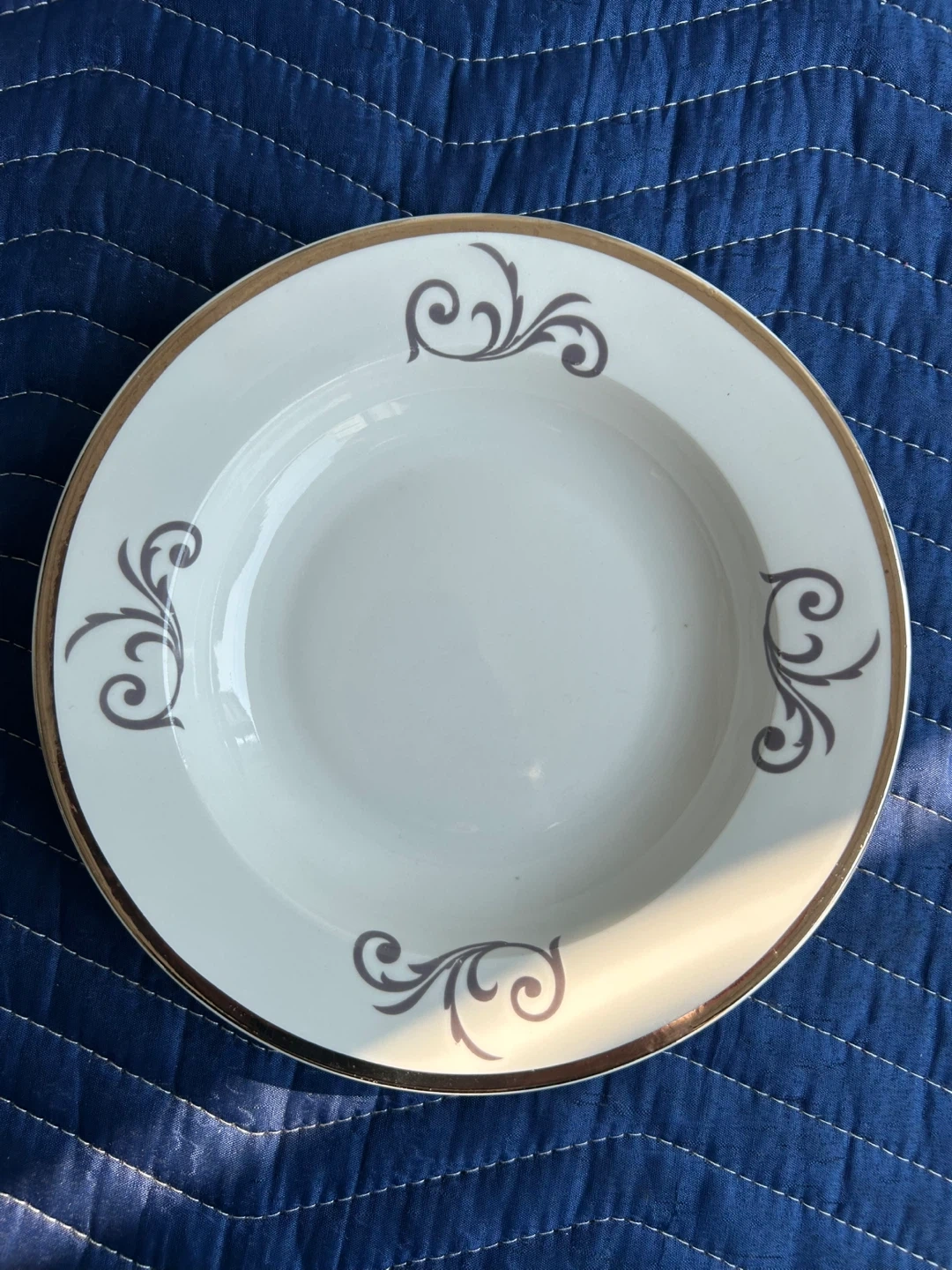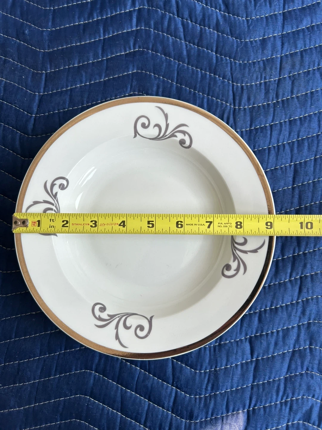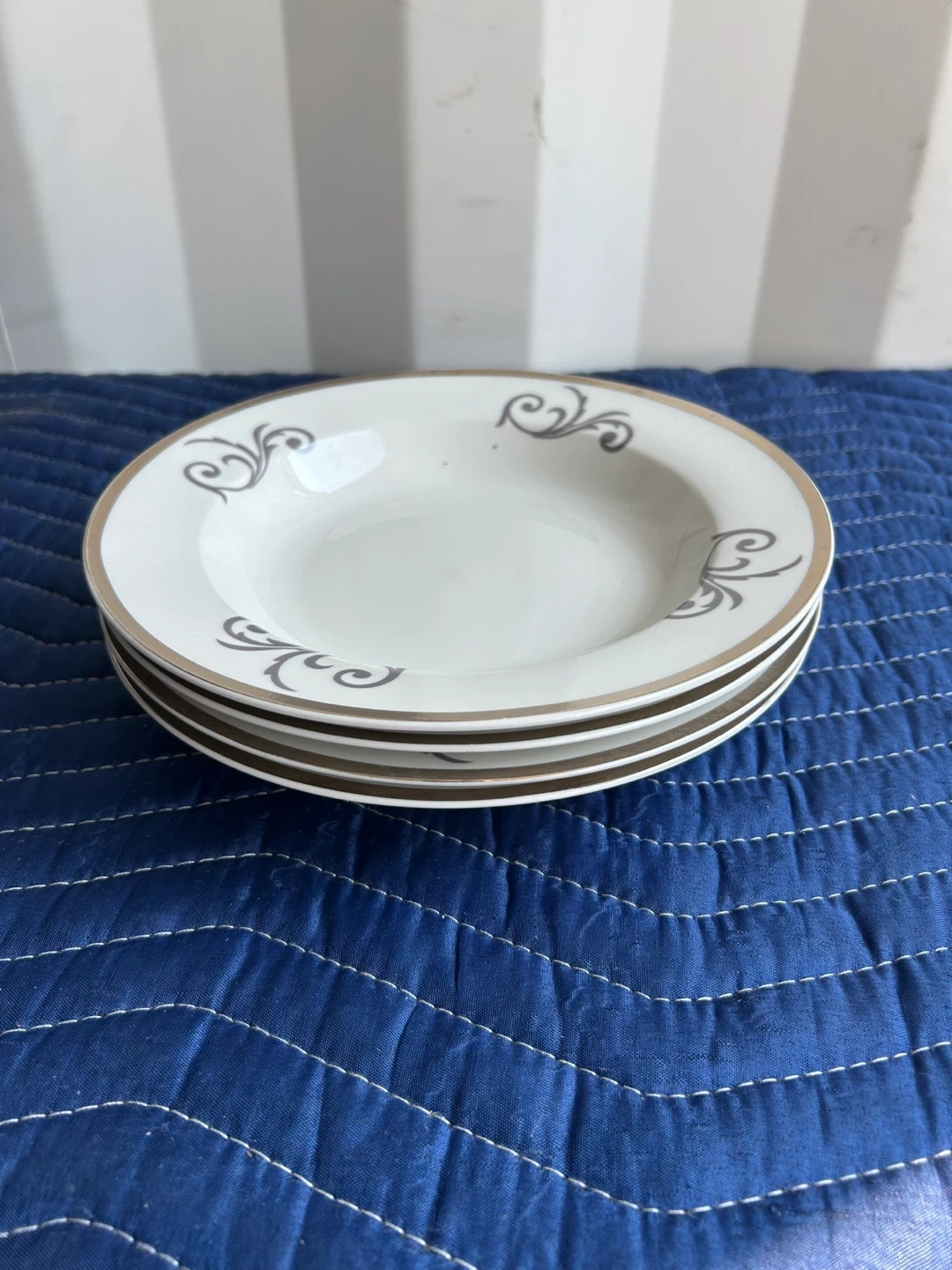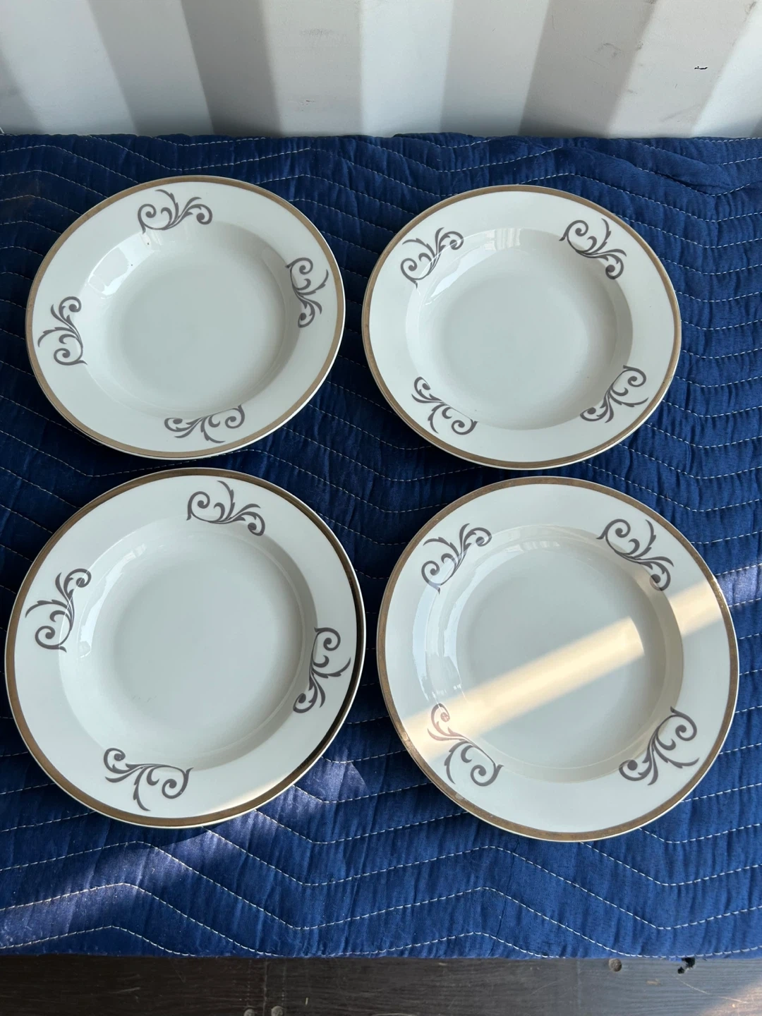 Selling a set of four Mantles Florentine soup bowls. They're white with a gold rim and a lovely decorative pattern. Each bowl is approximately 9 inches in diameter. Perfect for adding a touch of elegance to your table!