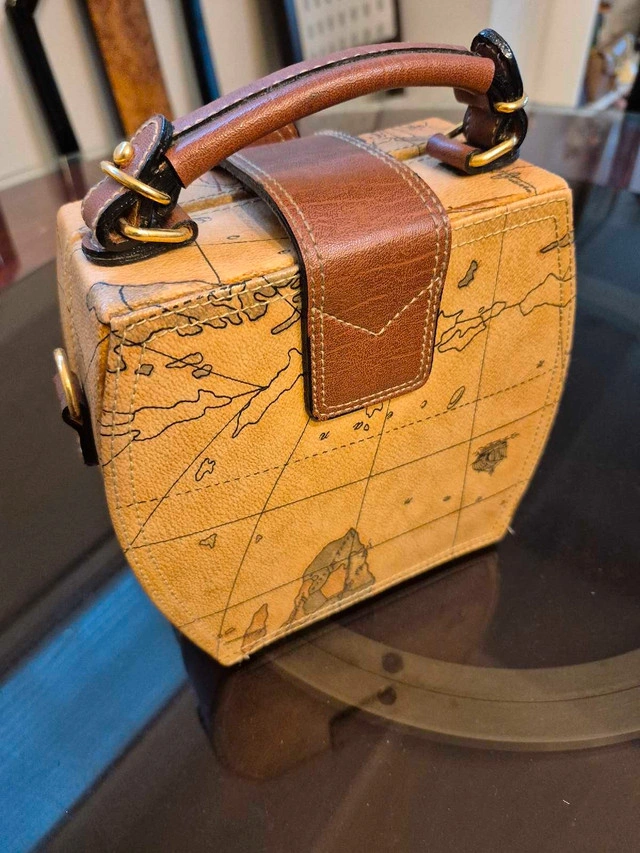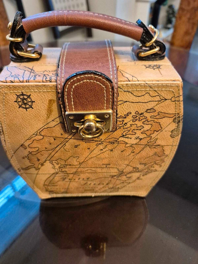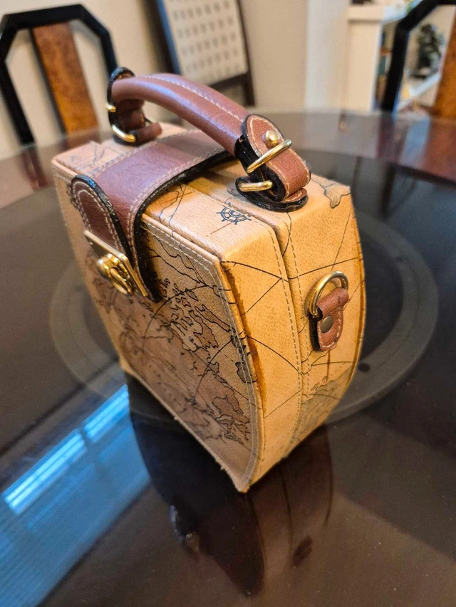 Add a touch of vintage charm to your collection with this unique map-patterned handbag! This pre-owned, small handbag features a distinctive map design, perfect for adding a worldly flair to any outfit. The bag has a structured shape and a sturdy handle, making it both stylish and practical. * **Design:** Map pattern * **Style:** Handbag * **Condition:** Used Looking at similar handbags on Kijiji, a fair price range for this unique piece would be $20-$40. If the ad is up, the bag is still available!