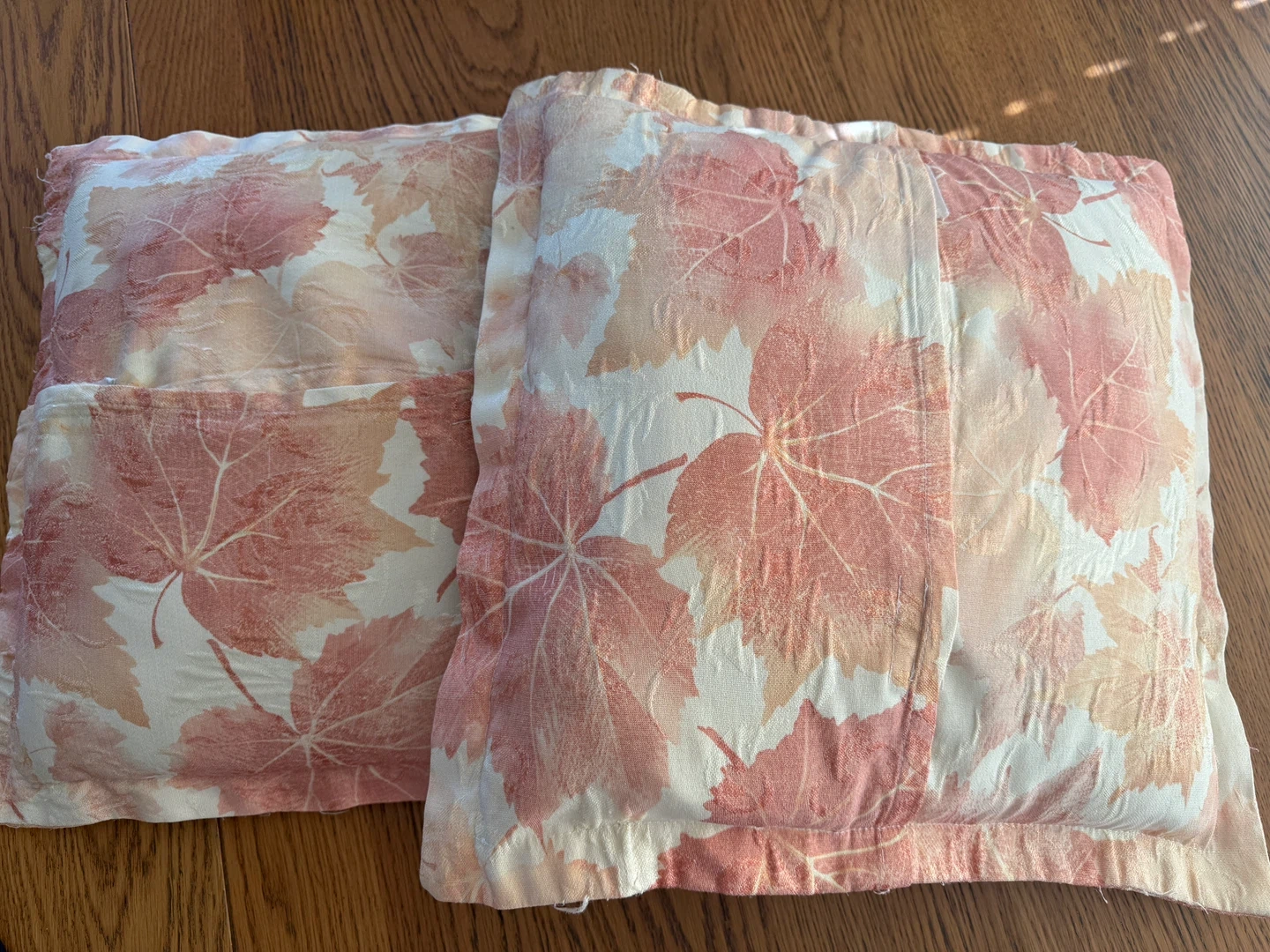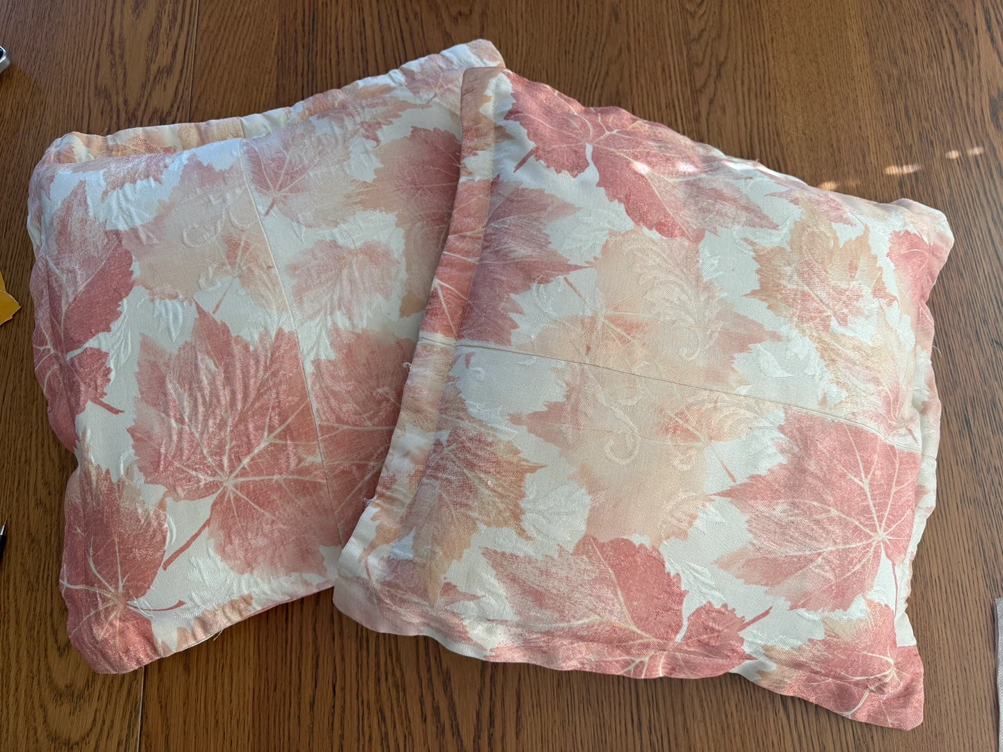 Selling a set of two decorative throw pillows. They feature a lovely leaf pattern in shades of pink and white. These pillows are perfect for adding a touch of cozy charm to your living room or bedroom. They're in great shape and ready for a new home!