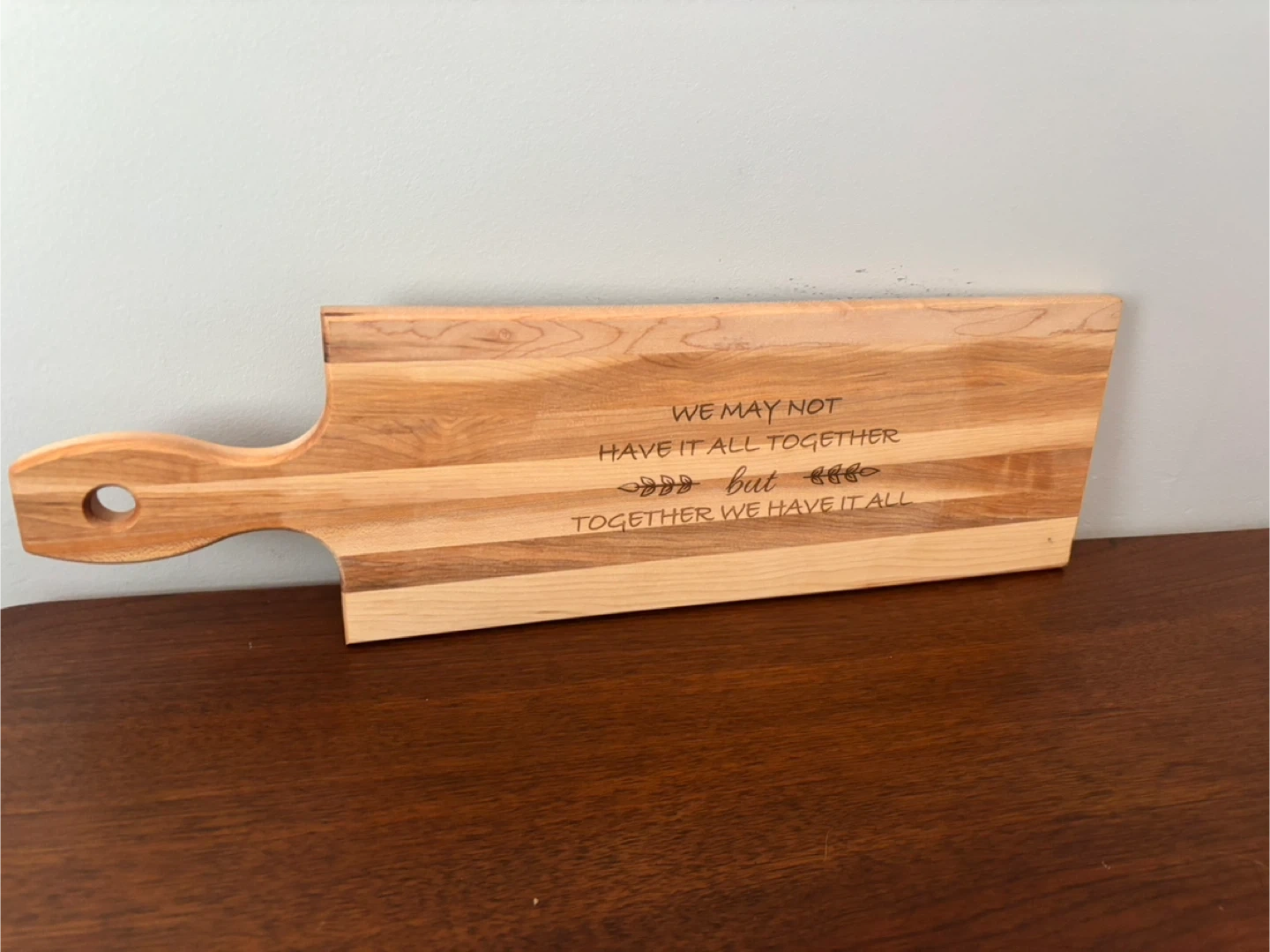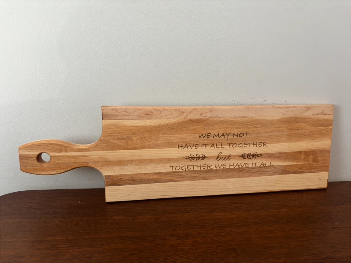 I'm selling a maple wooden cutting board with a handle. It has a unique engraved message: "We may not have it all together, but together we have it all". It's perfect for serving or as a decorative piece in your kitchen. The board has a smooth finish and is in excellent new condition! I never used it. Sells on wayfair for 80. 20” long and 6” tall. Cash only.