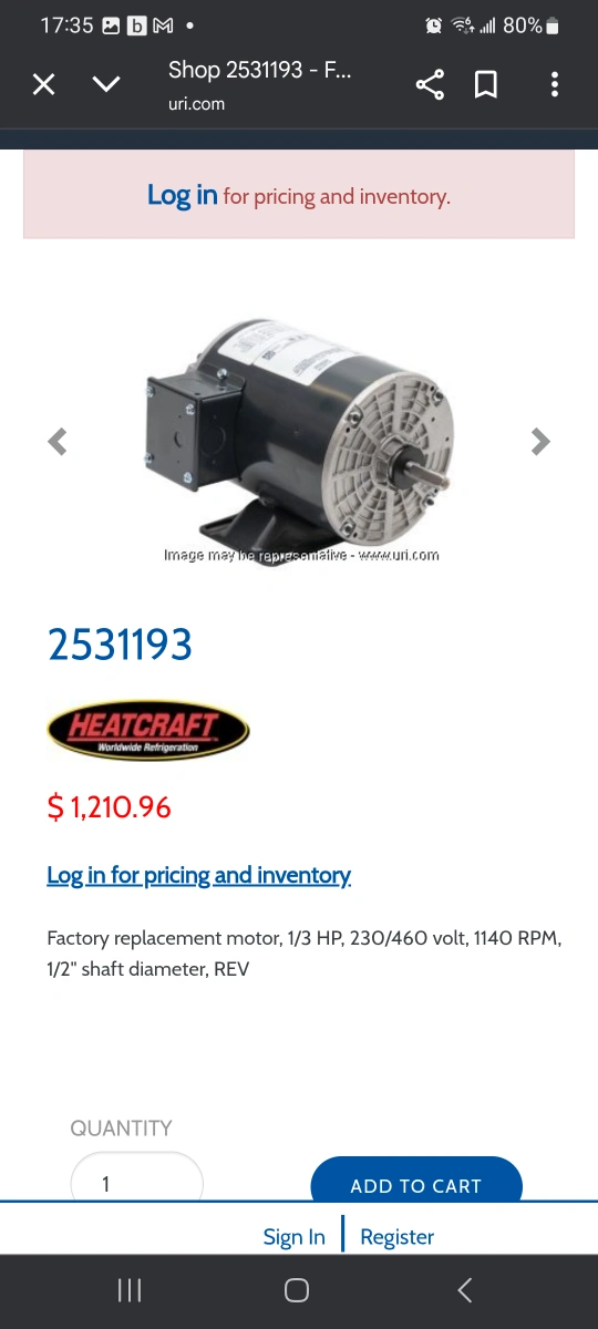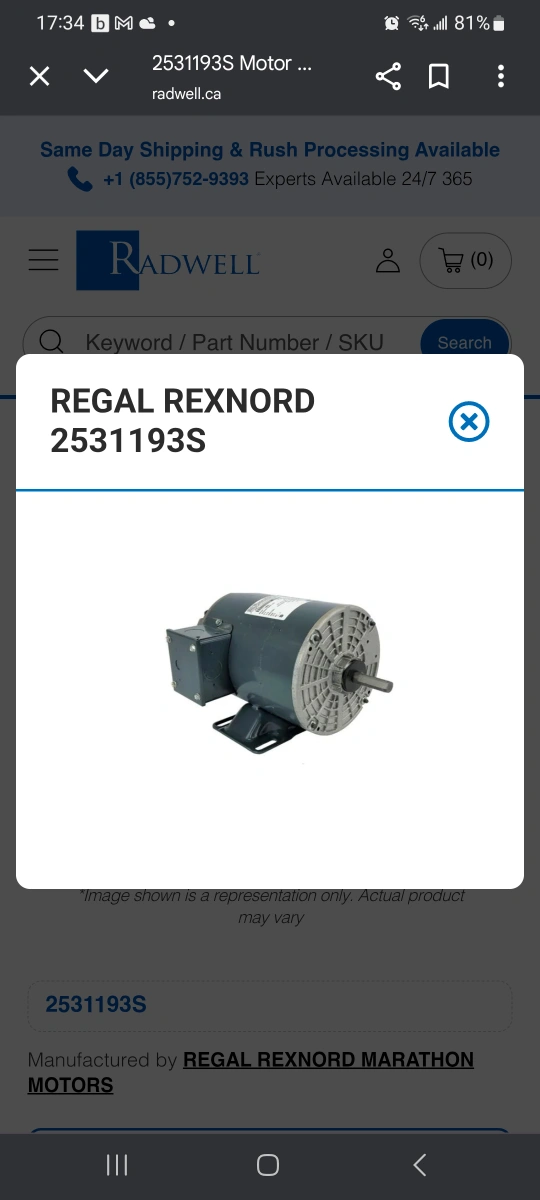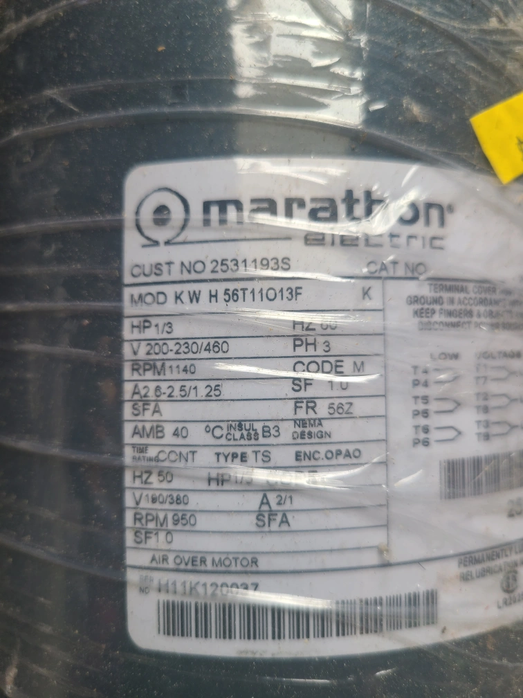 Selling a Marathon Electric Motor, model 2531193S. It's manufactured by REGAL REXNORD MARATHON MOTORS. Key specs include: - 1/3 HP - 200-230/460 V - 1140 RPM - 40°C Ambient Temperature This motor is suitable for various applications