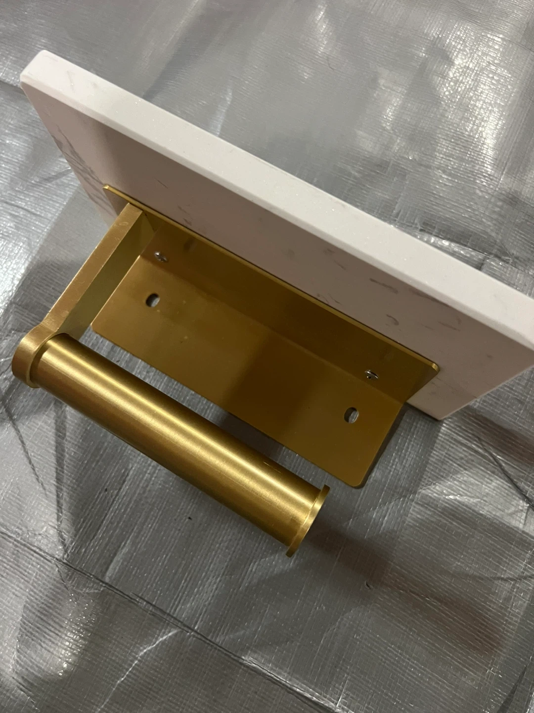 Add a touch of elegance to your bathroom with this stylish toilet paper holder! It features a beautiful marble-look top paired with a sleek gold-tone metal holder. It's in excellent condition and ready to elevate your bathroom decor